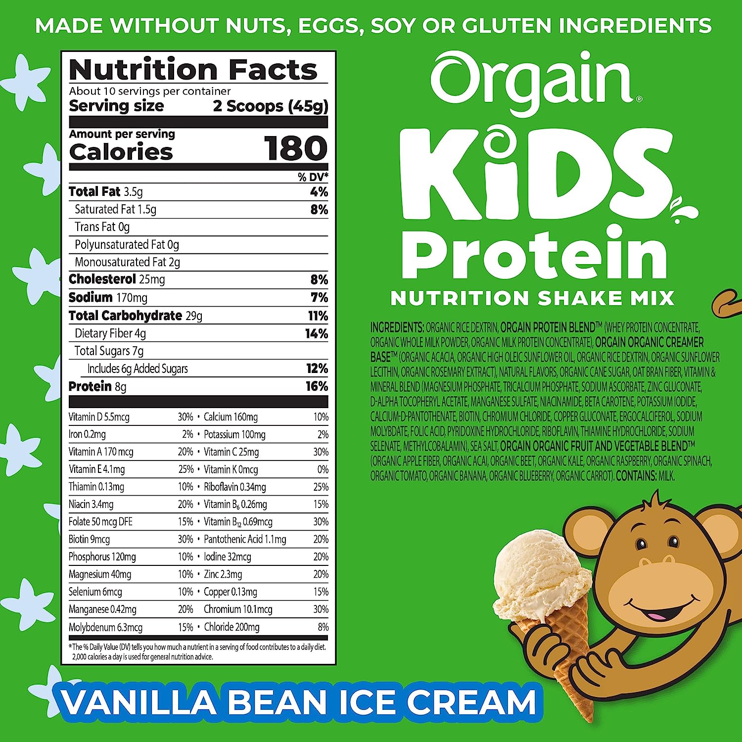 DESCRIPTION : Orgain Kids Protein Powder Shake Mix, Vanilla Bean Ice Cream - 8g Dairy Protein, 22 Vitamins & Minerals, Fruit & Vegetable Blend, Gluten Free, No Soy Ingredients, Add Nutrients to Kids Snacks - 1lb