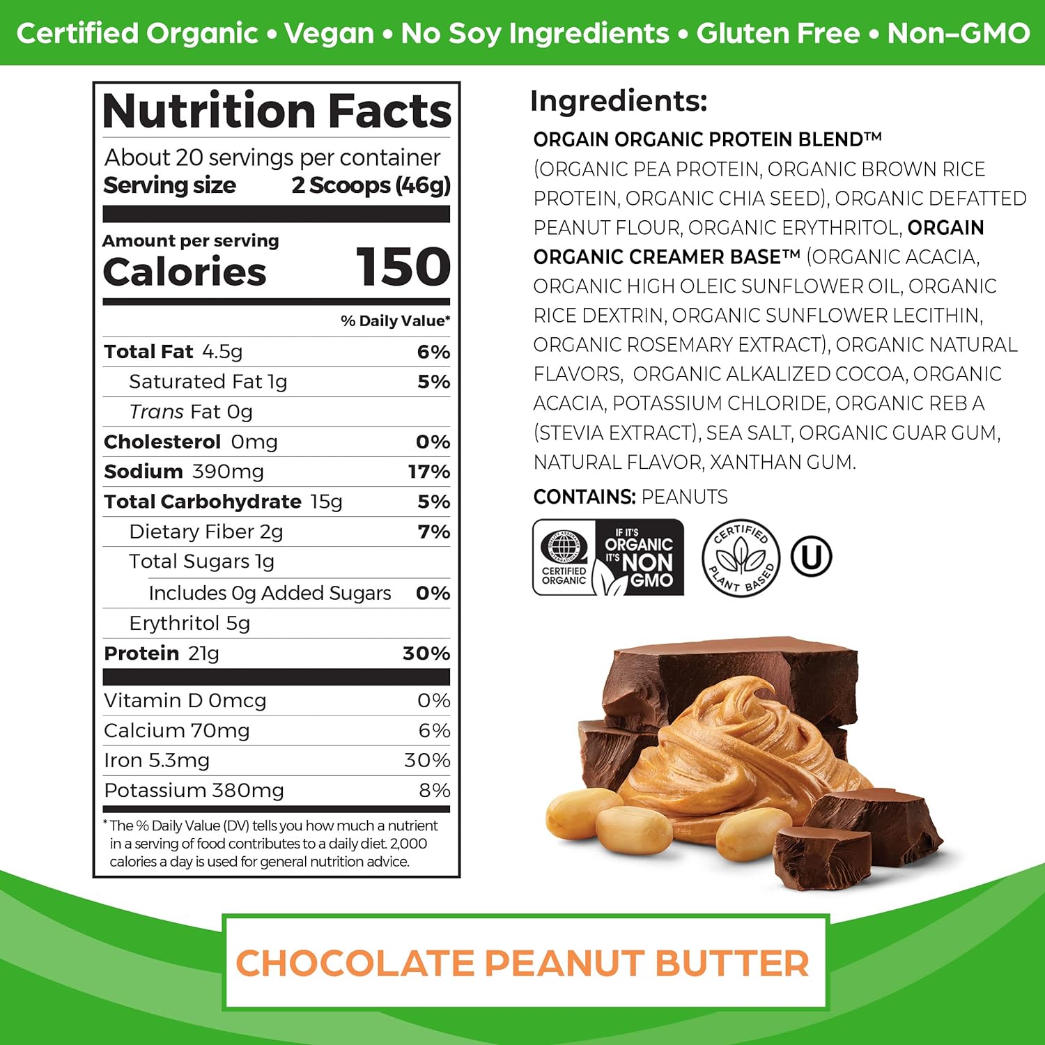 New look and label, same great product. Includes 1 (2.03 pound) Orgain organic plant based chocolate peanut butter protein powder21 grams of organic plant based protein (pea, brown rice, chia seeds), 2 grams of organic dietary fiber, low net carbs, 0 grams of added sugar, 150 calories per servingUSDA organic, vegan, gluten free, dairy free, lactose free, low net carbs, no added sugar, soy free, kosher, Non GMO, carrageenan free, and no artificial ingredientsMix with water, milk, or your favorite protein shake recipe for a quick breakfast or snack drink. Use when baking to give your cakes, muffins, brownies, or cookies a protein and energy boostIdeal for healthy, on the go nutrition for men, women, and kids. These are great for meal replacement, smoothie boosters, building lean muscle, muscle recovery, and pre or post workoutsWhat makes this the #1 plant protein powder brand in the U.S.^? Is it the smooth and creamy flavor? The delicious taste without the grit? The fact that it serves up 21 grams* of organic, vegan protein? Or that it's so easy to prepare? Truthfully, it's all of this and so much more. Our protein blend consists of organic peas, brown rice, and chia seeds, to provide a complete protein with all nine essential amino acids. Not only does our plant-based protein powder serve up the tastiest, creamiest protein, but it's also made with clean ingredients and higher standards in mind! Enjoy a protein powder that's certified USDA organic, non-GMO, and made without soy, dairy, gluten, or artificial preservatives, sweeteners or flavors. On top of all of that, it boasts 6g* of prebiotic + fiber, 1g of sugar*, and has 150 calories.* Plus, when it comes to flavor and versatility, this powder delivers. Mix our plant-based protein powders with your favorite smoothies, almond or oat milk, and even baking mixes to add a good, clean boost. At Orgain we celebrate taste, and we take it seriously because we recognize that part of living a vibrant life is loving what you eat. Go ahead, fuel up with the powder that's a treat for both your taste buds and your body so you can have energy to keep on going! ^Source: IRI, Total US MULO, Latest 52 weeks ending 10.30.22 *per serving