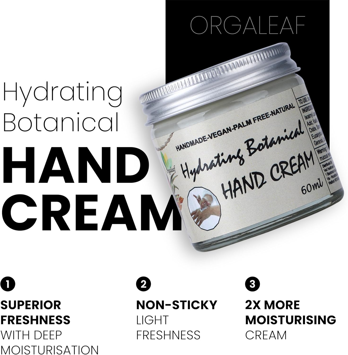 Orgaleaf Hand Cream, Hydrating Botanical Hand Cream, Vegan, Hand Made, Natural, 60 ml