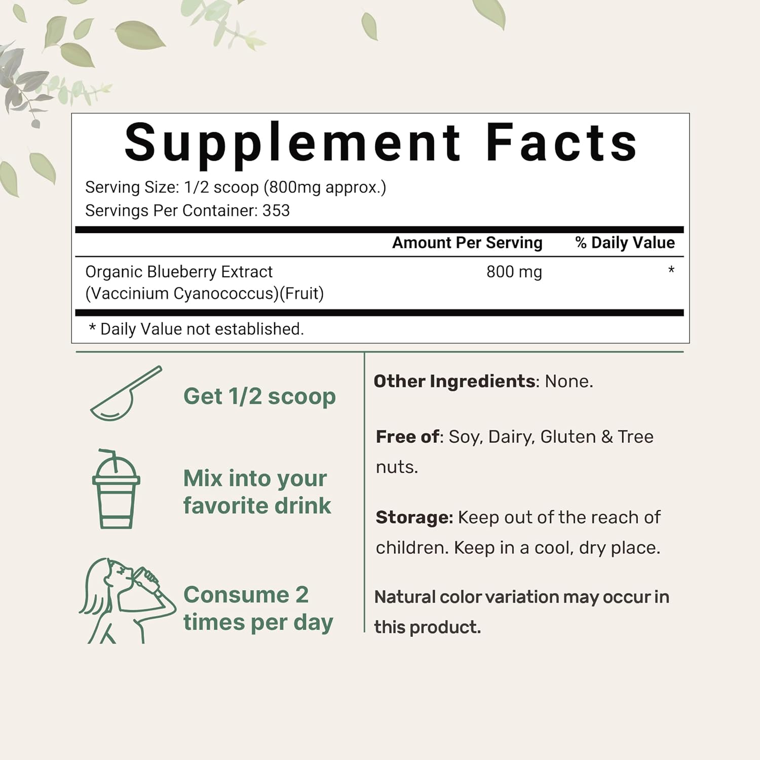 Each Pouch Contains 10* Ounces Of Fresh Blueberry Powder, 1/2 Scoop Serving Size Equals Approx. 800Mg, Lasts Up To A 212 Day Supply
