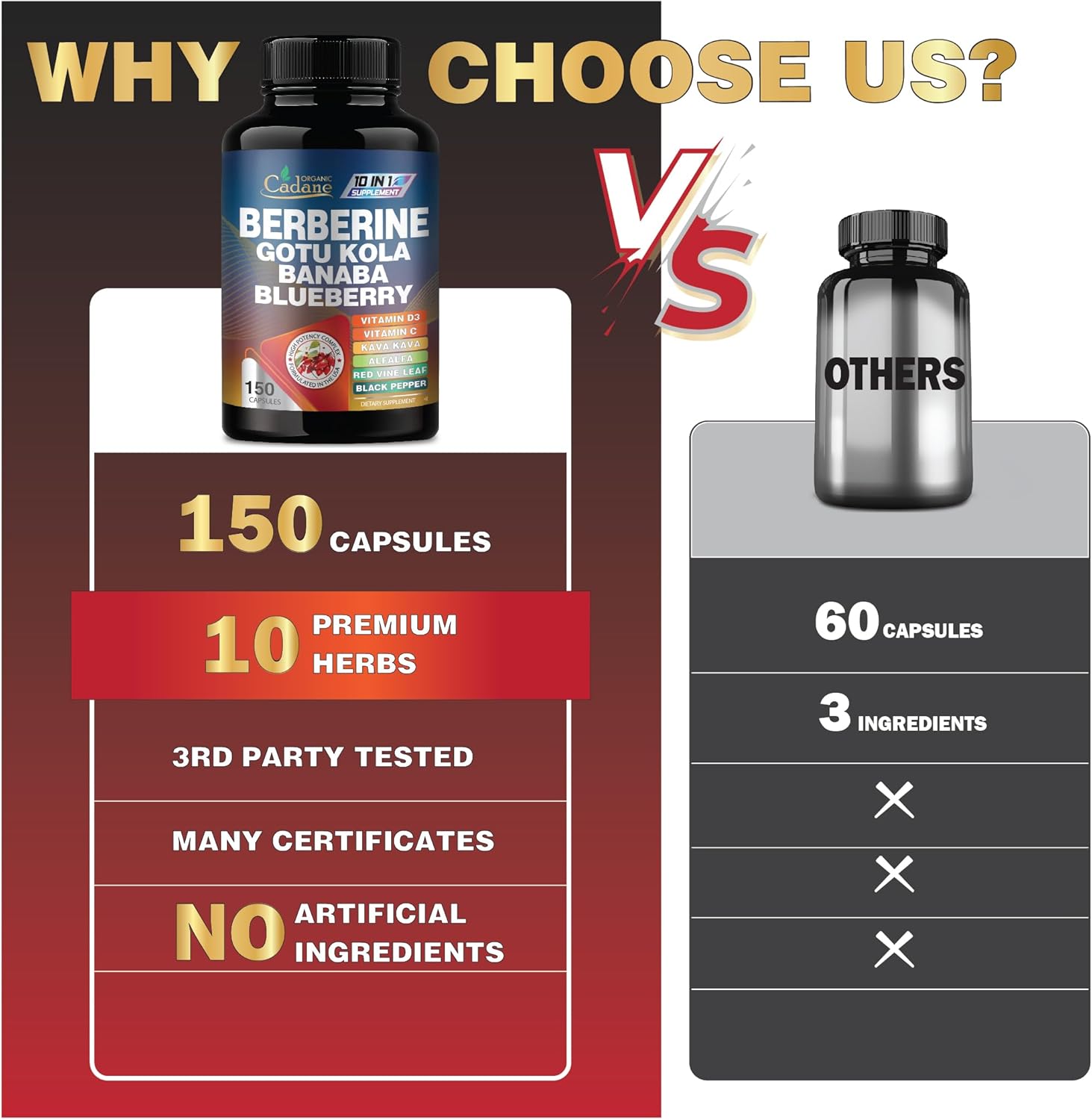 Potent Formula: Our Berberine Capsules includes 9 multi-ingredients, a powerful blend featuring Berberine, Vit D3, VitC, Gotu Kola, Banaba Leaf, and more. Our brand Cadane has researched and developed comprehensive and optimal formula for Berberine complex supplement, which provides great advantages and results for various health needs, promoting overall health and well-being