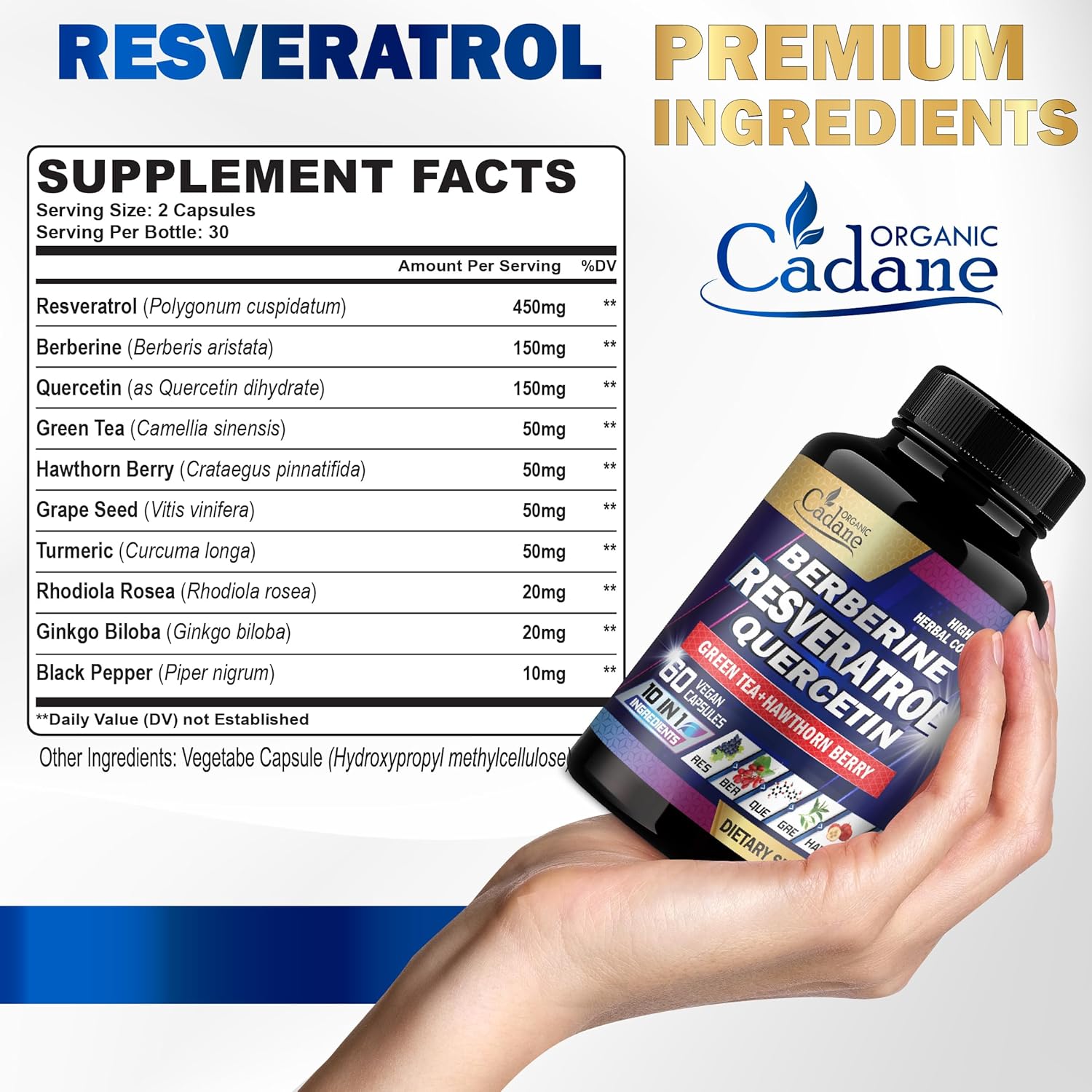 Organic Cadane Premium Resveratrol Supplement - Healthy Aging, Heart, Brain & Immune Support - 10In1 With Quercetin, Berberine, Green Tea, Turmeric, Black Pepper & More - 60 Capsules