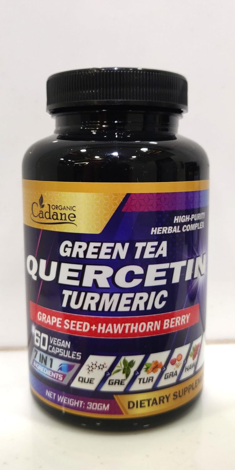 About this item A combination of the of Quercetin powder, Green Tea, Grape Seed, Hawthorn Berry, Berberine, Turmeric, and Rhodiola Rosea Quercetin Complex is the key to elevating your wellness journey with a combination of herbs. Regular use of the product will result in specific support for energy production, immune system health. Just 2 capsules daily with meals and plenty of water. Each bottle contains 60 quercetin capsules and the usage time will last about 30-day consumption. Quercetin Extract is a combination of plant-based ingredients sourced from reputable suppliers who uphold strict quality standards. Each ingredient is carefully selected for its effectiveness. Furthermore, our product undergoes rigorous third-party testing and is manufactured in a GMP, ISO-certified facility, guaranteeing consistency and top-notch quality in every bottle At Cadane, we are dedicated to supporting your health, and our mission is to provide you with an optimized solution. We guarantee product quality because we believe your well-being is paramount. If, for any reason, you are unsatisfied with your order, contact us immediately to get it resolved. Please rest assured to use our products. Your satisfaction and health are our priorities. See more product details, A combination of the of Quercetin powder, Green Tea, Grape Seed, Hawthorn Berry, Berberine, Turmeric, and Rhodiola Rosea, Quercetin Complex is the key to elevating your wellness journey with a combination of herbs. Regular use of the product will result in specific support for energy production, immune system health, Just 2 capsules daily with meals and plenty of water. Each bottle contains 60 quercetin capsules and the usage time will last about 30-day consumption, Quercetin Extract is a combination of plant-based ingredients sourced from reputable suppliers who uphold strict quality standards. Each ingredient is carefully selected for its effectiveness. Furthermore, our product undergoes rigorous third-party testing and is manufactured in a GMP, ISO-certified facility, guaranteeing consistency and top-notch quality in every bottle, At Cadane, we are dedicated to supporting your health, and our mission is to provide you with an optimized solution. We guarantee product quality because we believe your well-being is paramount. If, for any reason, you are unsatisfied with your order, contact us immediately to get it resolved. Please rest assured to use our products. Your satisfaction and health are our priorities