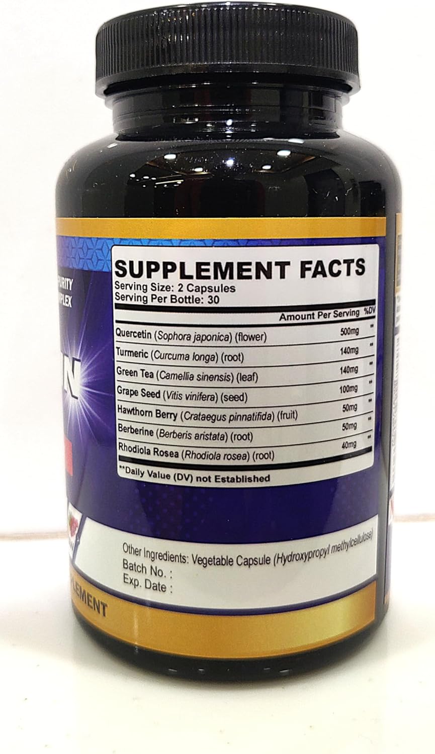 Organic Cadane Quercetin Supplements -7 Ingredients Extract With Green Tea, Grape Seed, Turmeric & More - 60 Capsules