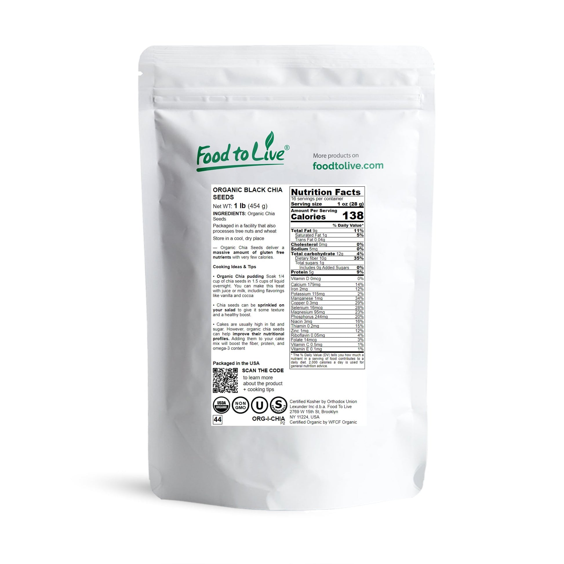 Certified Organic Chia Seeds from Food To Live are a top-quality product that allows you to enjoy all the health benefits this food offers. Our product is 100% free from GMO and any dangerous toxins, so you are safe to include it in your diet. Raw chia seeds are good for you in many ways. In fact, they are so good nutritionally that these seeds can be considered paleo. However, in this case, you need to keep their consumption low. Chia seeds can be included in almost any diet. Milled and ground seeds are used by many bakers as alternatives to other flours. The most important benefits of chia seeds include but aren’t limited to: - Plant-based source of omega 3 fats - Facilitated weight loss - Digestive health support - Healthy heart and vessels Nutritional Value The extremely high Organic Black Chia Seeds nutrition value is the reason why the seeds are considered a superfood. They provide you with a large dose of numerous nutrients, including: - Thiamine - Riboflavin - Folate - Niacin - Iron - Calcium - Magnesium - Phosphorus - Zinc - Manganese The B vitamins, in particular, take part in a variety of important chemical processes in the body. Therefore, including Food To Live Organic Chia Seeds in your diet definitely is a great decision. You should eat about 1-2 tablespoons per day to enjoy the health benefits they provide. Note that chia seeds have a reasonably high protein content (4.6 grams per 1 ounce of seeds). Therefore, they can be a good source of easily absorbable protein for athletes, vegans, and vegetarians. These seeds help you lose weight due to their nutritional value and high fiber content.This product is processed in a facility that also processes tree nuts and wheat. Organic Chia Seeds, 1 Pound - Black, Vegan, Kosher, Non-GMO, Great for Smoothies, Sirtfood - by Food to Live