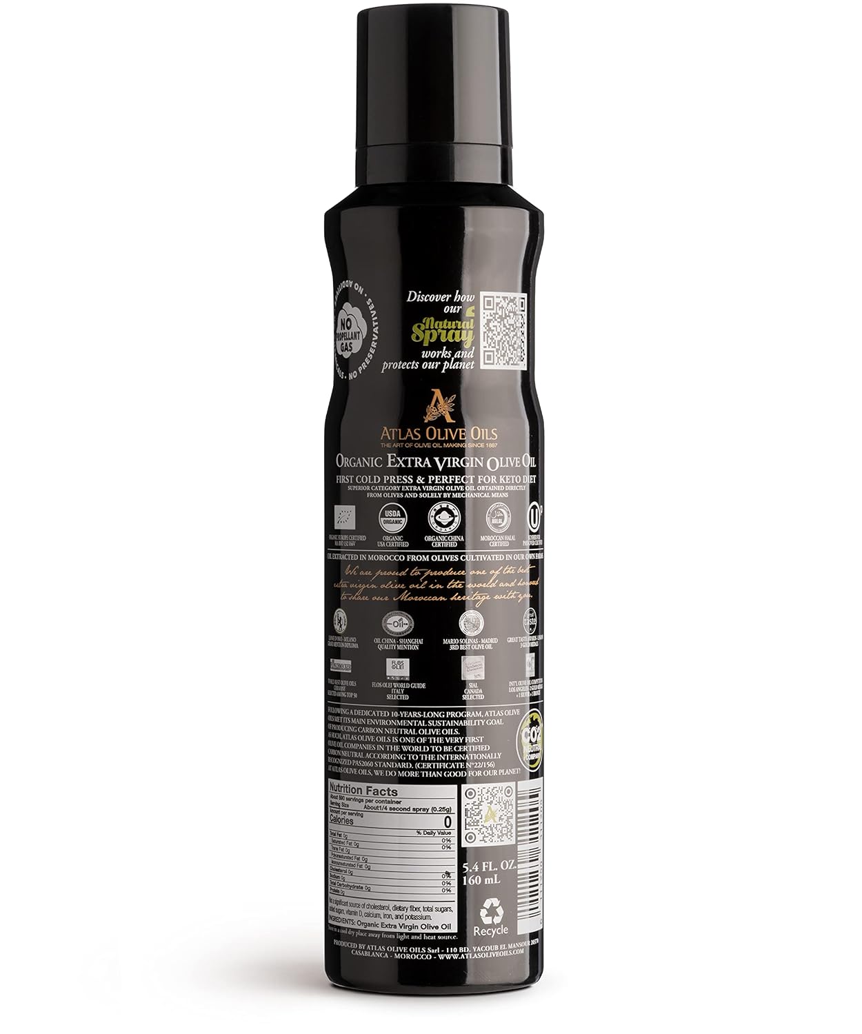 Delicious Polyphenol Rich Oil Atlas Organic Extra Virgin Olive Oil Spray Has Incredible Flavor, Aroma, Style, And Standards Of Health. An Oil Rich In Polyphenols, 100% Chemical Free, And Healthy Too! Usda Certified Organic, Ou Kosher For Passover, Halal, Iso22000, Haccp And Gmp Certified, And Cholesterol And Carbohydrate Free