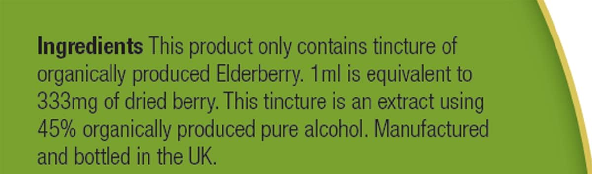 Made with organic elderberries and organically produced 45% v/v pure alcohol