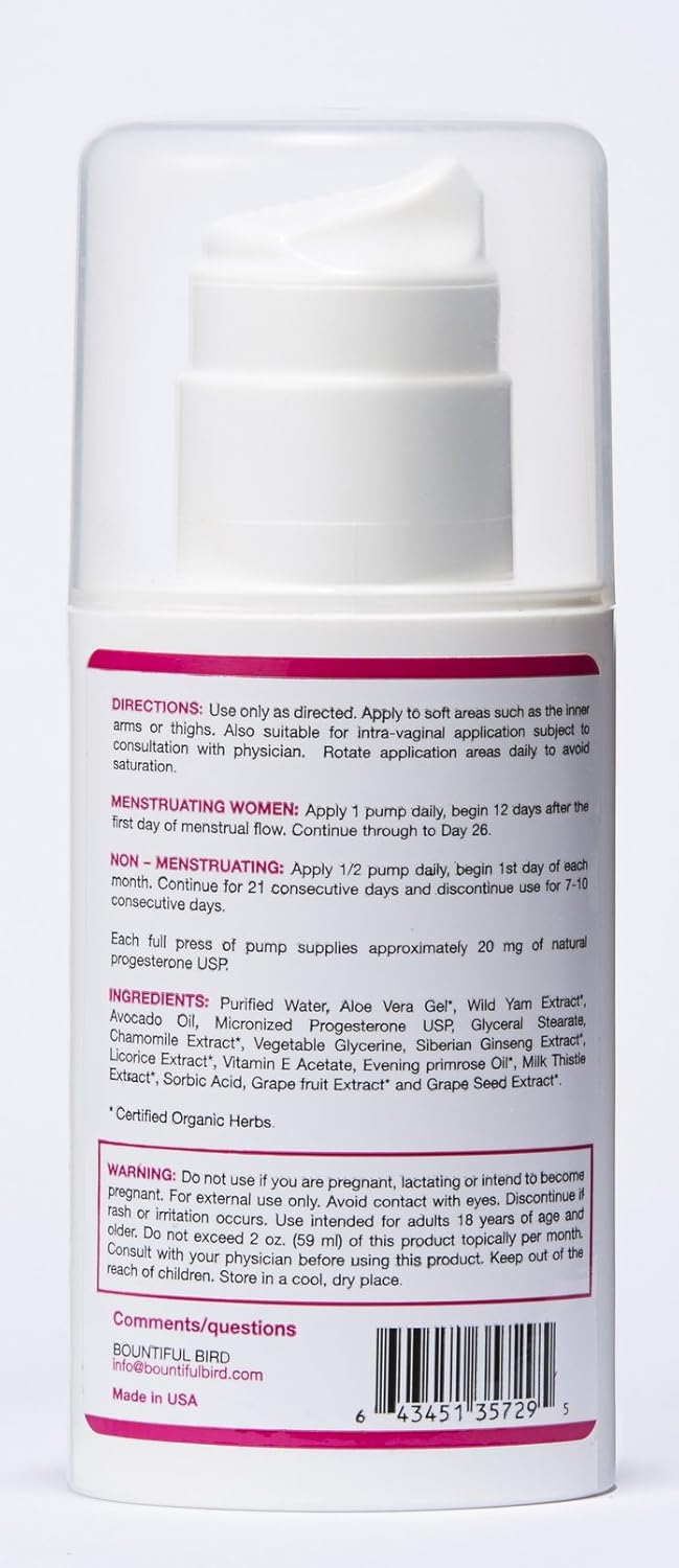 Bountiful Bird Natural Progesterone For Women Is Derived From Wild Yam And Contains Recommended Dosage Of 2% Micronized Usp Progesterone Our Formula Is Highly Absorbance, Unscented And Leaves No Residue And Contains No Nasty Chemicals, No Preservatives, No Paraben, Non Gmo, No Fragrance Or Artifical Coloring Bountiful Bird Progesterone Cream For Women Contains Organic Herbs Such As Wild Yam Extract, Chamomile Extract, Siberian Ginseng Extract, Licorice Extract, Evening Primrose Oil Milk Thistle Extract Grape Seed Extract Recommended Dosage : For Pre-Menopausal Women, The Recommended Dose Is 1 Pump Or ½ Tea Spoon Daily For Post-Menopausal Women, The Dose That Often Works Well Is ½ Pump Or ¼ Tea Spoon Daily Where To Apply - Because Progesterone Is Fat-Soluble, It Is Easily Absorbed Through The Skin And Absorbed Into Our Capillary Blood. Best Absorption Is Through Thin Skin Surfaces Where People Blush Such As Face, Neck, Chest, Breasts, Inner Arms And Palms Of The Hands. **Bonus** We Have Created A Free Symptom Tracker For You To Use Alongside Bountiful Bird Progesterone Cream. It Is Useful For Identifying Symptom Patterns That May Help You Navigate Your Day/Month Better. It Will Be Emailed To You With Your Order