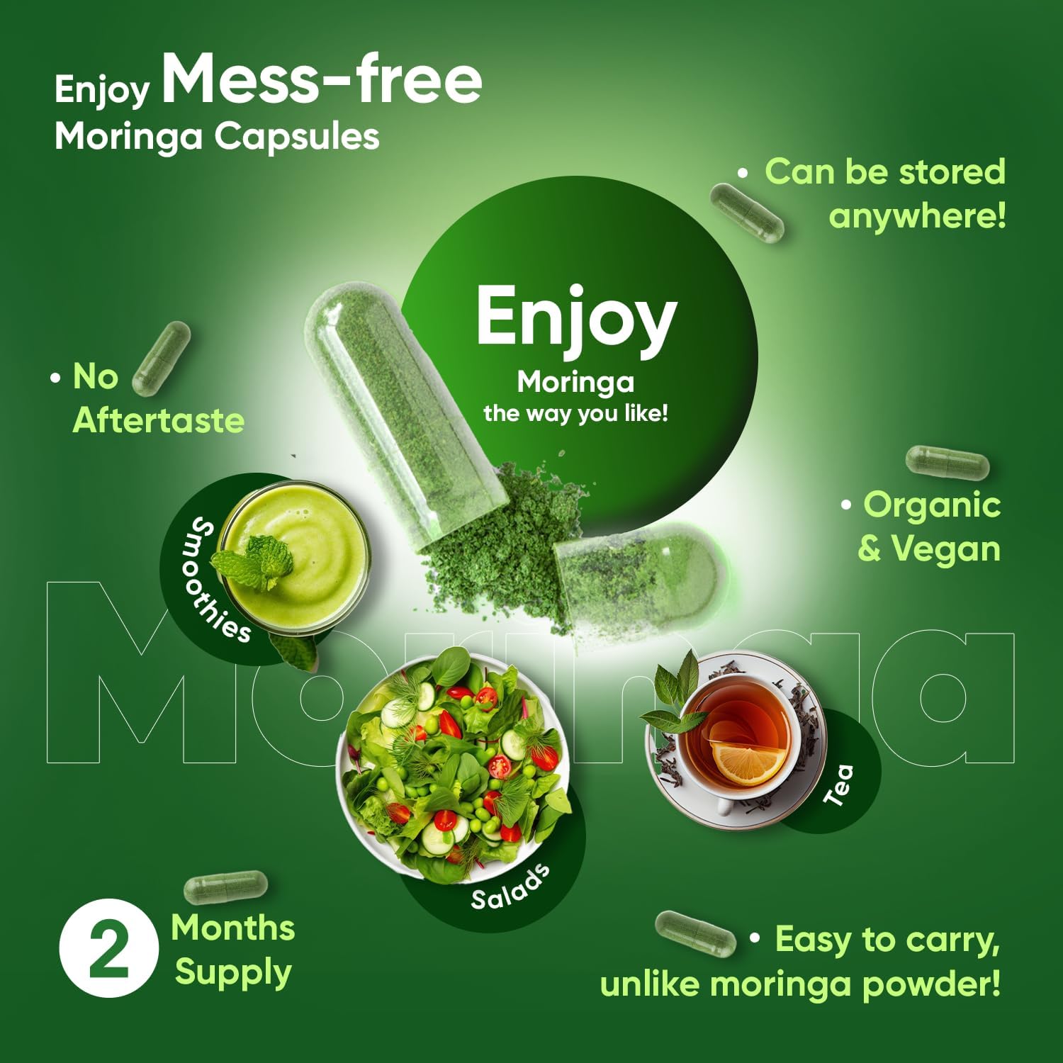VEGAN & PURE MORINGA POWDER CAPSULES: Our GMP-certified organic moringa capsules are one of the best vegan and do not include any binders, fillers or excipients like other moringa powder in the market. The Moringa powder organic capsules are formulated by healthcare professionals & are vegetarian-friendly, non-GMO, gluten- & lactose-free. Get all the essential nutrients effortlessly with our nutrient-rich & convenient Moringa leaf capsules (not moringa gummies)!