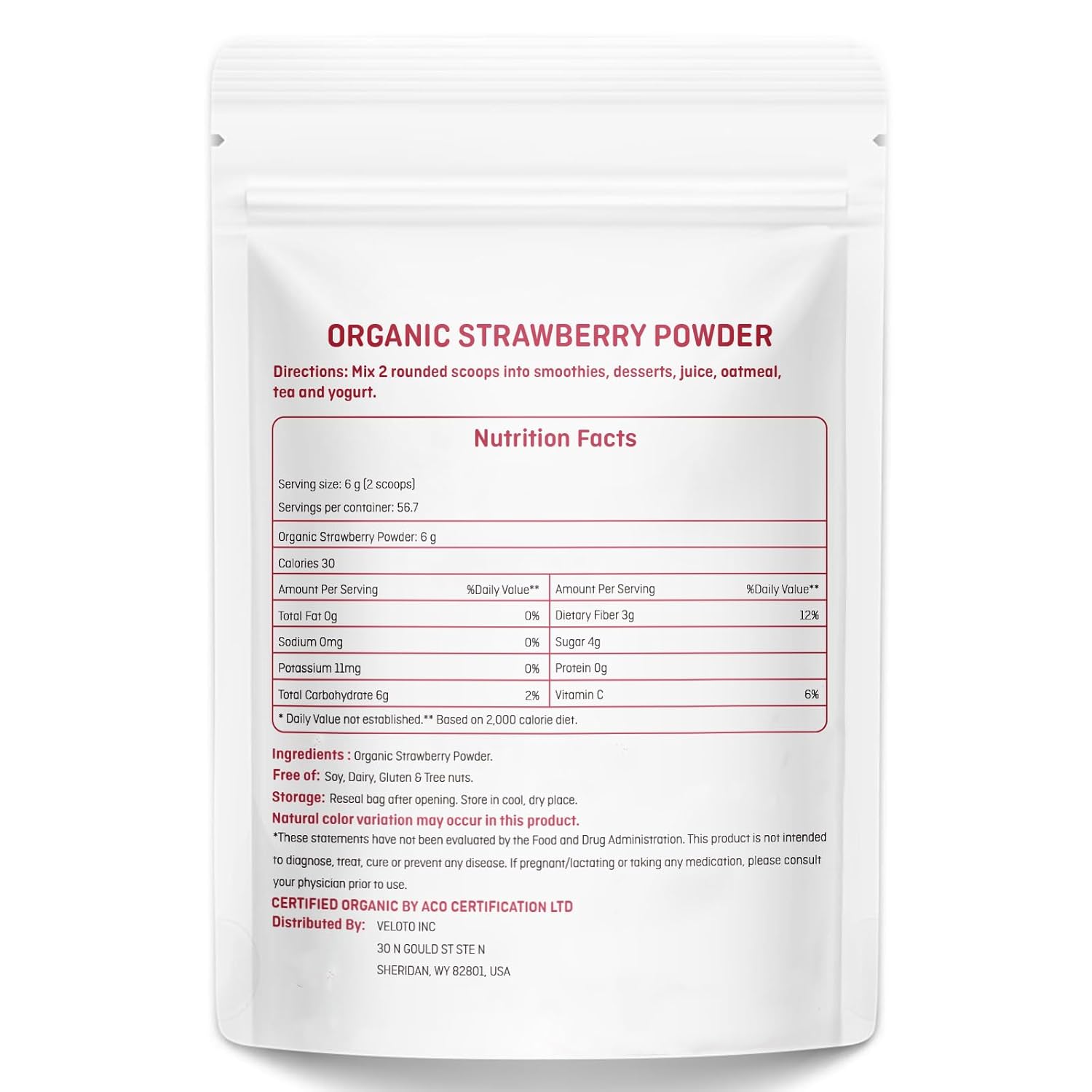 DIETARY FIBER SUPPLEMENT: Organic strawberry powder contains very low-calorie pectin and dietary fiber, which can increase the feeling of fullness and aid digestion.VELOTO strawberry powder is Kosher, Non-GMO Certified. Gluten-free