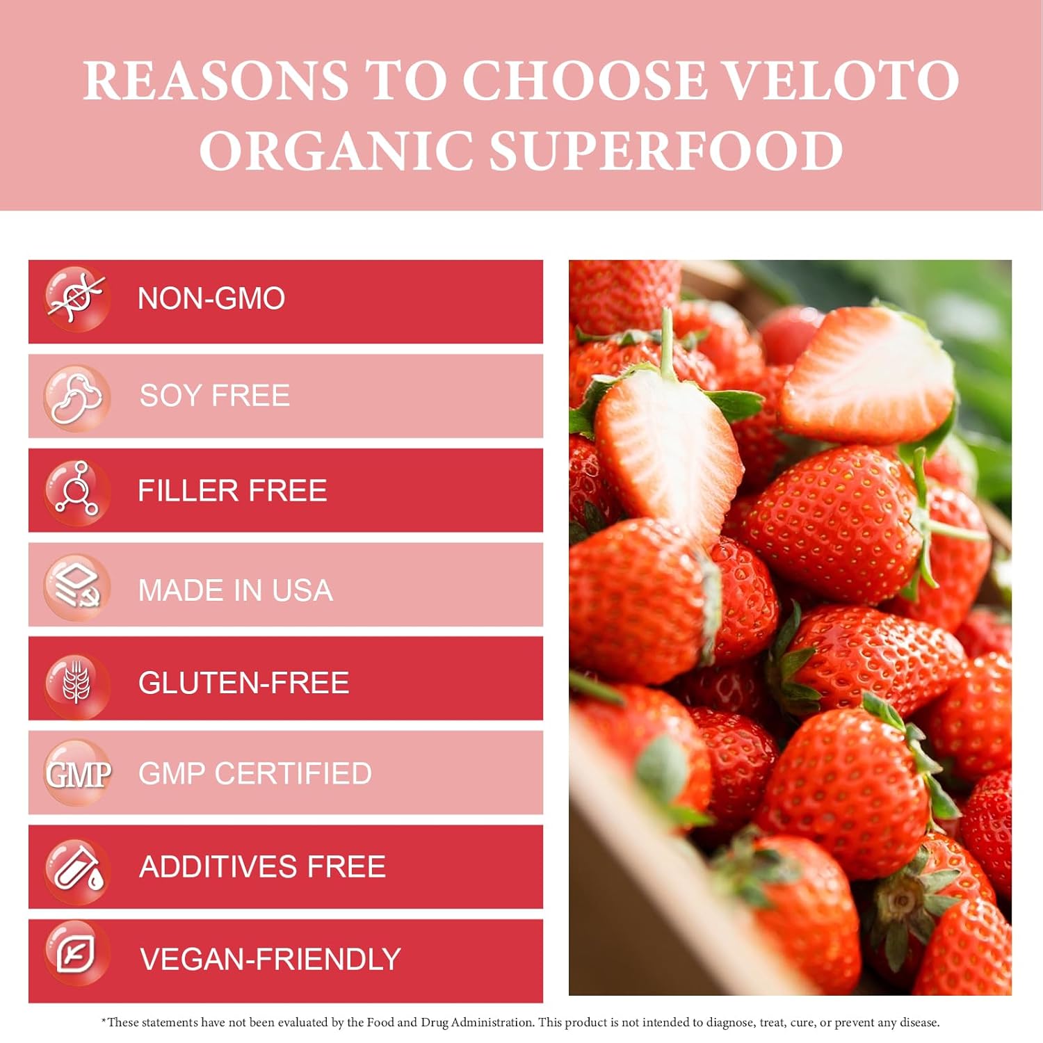 MULTIPLE TYPES HEALTH PROTECTION: VELOTO organic strawberry freeze dried powder's various production processes are all carried out in the United States. The production factory has a production workshop that meets GMP requirements. No Additives
