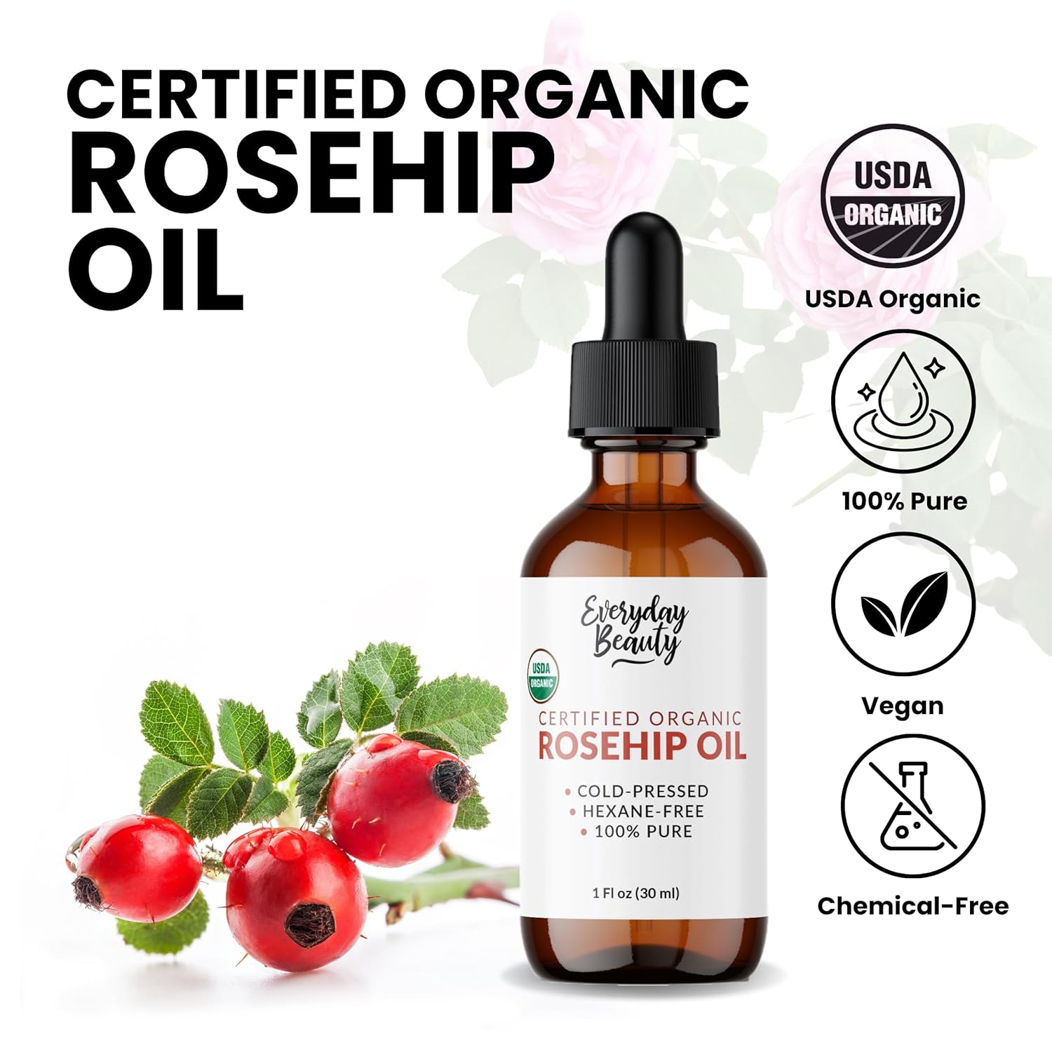 About this item 100% Pure & USDA Certified Organic – Our rosehip oil is extracted from the seeds of Rosa canina using a cold-pressed, unrefined process that retains its full nutritional profile. Certified organic and free from additives, chemicals, or synthetic ingredients. Deeply Hydrating & Anti-Aging – Naturally rich in essential fatty acids, vitamins A and C, and antioxidants, this oil intensely hydrates the skin while promoting a brighter, more even complexion. Helps fade dark spots, acne scars, and discoloration, smooth the appearance of fine lines and wrinkles, and support firmer, more youthful-looking skin. Perfect Lightweight Facial Oil – Non-Greasy, Fast-Absorbing & Gentle – Our organic rosehip oil is the ideal daily facial oil, delivering intense nourishment without the heaviness of traditional oils. It absorbs quickly into the skin, leaving no greasy residue—just a soft, smooth, and hydrated finish. Its lightweight texture makes it easy to layer with other skincare products. Ideal for Hair & Scalp – Lightweight, Hydrating & Restorative – Rich in essential fatty acids and antioxidants, organic rosehip oil helps soothe and moisturize a dry scalp while supporting healthy hair growth. It smooths frizz, adds shine, and helps repair dry or damaged strands without weighing hair down and is ideal for all hair types. Premium Packaging & Ethical – Packaged in a dark amber glass bottle to protect the oil from light and oxidation, with a precision glass dropper for easy, mess-free application. Our rosehip oil is vegan, cruelty-free, non-GMO, and free from synthetic preservatives, fragrances, and parabens—ethically sourced and responsibly produced for clean, conscious beauty. See more product details,100% Pure & USDA Certified Organic – Our rosehip oil is extracted from the seeds of Rosa canina using a cold-pressed, unrefined process that retains its full nutritional profile. Certified organic and free from additives, chemicals, or synthetic ingredients,Deeply Hydrating & Anti-Aging – Naturally rich in essential fatty acids, vitamins A and C, and antioxidants, this oil intensely hydrates the skin while promoting a brighter, more even complexion. Helps fade dark spots, acne scars, and discoloration, smooth the appearance of fine lines and wrinkles, and support firmer, more youthful-looking skin,Perfect Lightweight Facial Oil – Non-Greasy, Fast-Absorbing & Gentle – Our organic rosehip oil is the ideal daily facial oil, delivering intense nourishment without the heaviness of traditional oils. It absorbs quickly into the skin, leaving no greasy residue—just a soft, smooth, and hydrated finish. Its lightweight texture makes it easy to layer with other skincare products,Ideal for Hair & Scalp – Lightweight, Hydrating & Restorative – Rich in essential fatty acids and antioxidants, organic rosehip oil helps soothe and moisturize a dry scalp while supporting healthy hair growth. It smooths frizz, adds shine, and helps repair dry or damaged strands without weighing hair down and is ideal for all hair types,Premium Packaging & Ethical – Packaged in a dark amber glass bottle to protect the oil from light and oxidation, with a precision glass dropper for easy, mess-free application. Our rosehip oil is vegan, cruelty-free, non-GMO, and free from synthetic preservatives, fragrances, and parabens—ethically sourced and responsibly produced for clean, conscious beauty