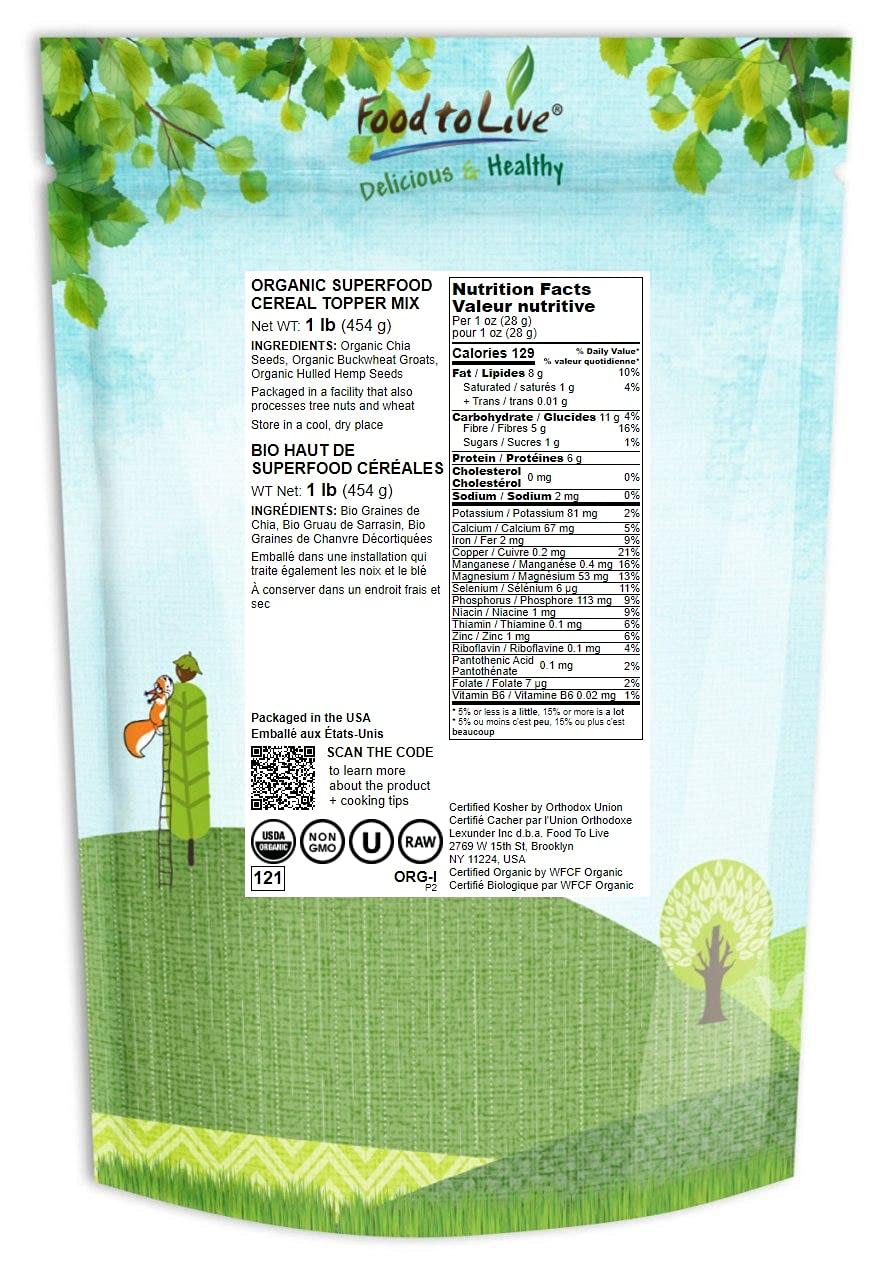 Organic Superfood Cereal Topper β With Non-Gmo Hemp, Chia And Buckwheat Seeds, Non-Irradiated, Kosher, Vegan, No Added Sugar And Salt, Excellent Source Of Omega-3, Good Source Of Fiber, Bulk