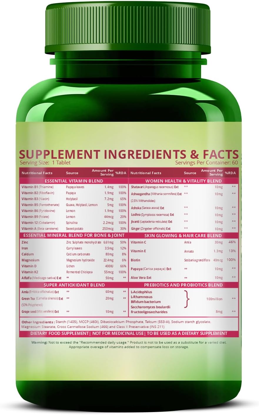Energy & Performance: Himalayan Organics Multivitamin With Probiotics Has Essential Vitamin, Mineral, Metabolism And Antioxidant & Vitality Blend Comprising Of Natural Extracts & Nutrients Like Spirulina, Ginseng, Astaxanthin, Vitamin D3, Vitamin B12, Iron & More That Fasten Metabolic Process In Your Body, Discourage Oxidative Stress, Enhance Energy Levels & Also Boost Healthy Immune Cells. Skin & Hormonal Balance: Women Undergo Hormonal Changes From Time To Time. Himalayan Organics Multivitamin With Probiotics For Women Lends Support To Balance & Maintain Hormonal Levels With The Help Of Ingredients Like Shatavari, Ginseng, Green Tea, Vitamin B12 & More. Moreover, Antioxidants, Amino Acids, Biotin, Grapeseed, Astaxanthin & Vitamin C Work Together To Nourish Your Skin Cells Deeply. Time To Freshen Your Skin, Mood & Body Together!