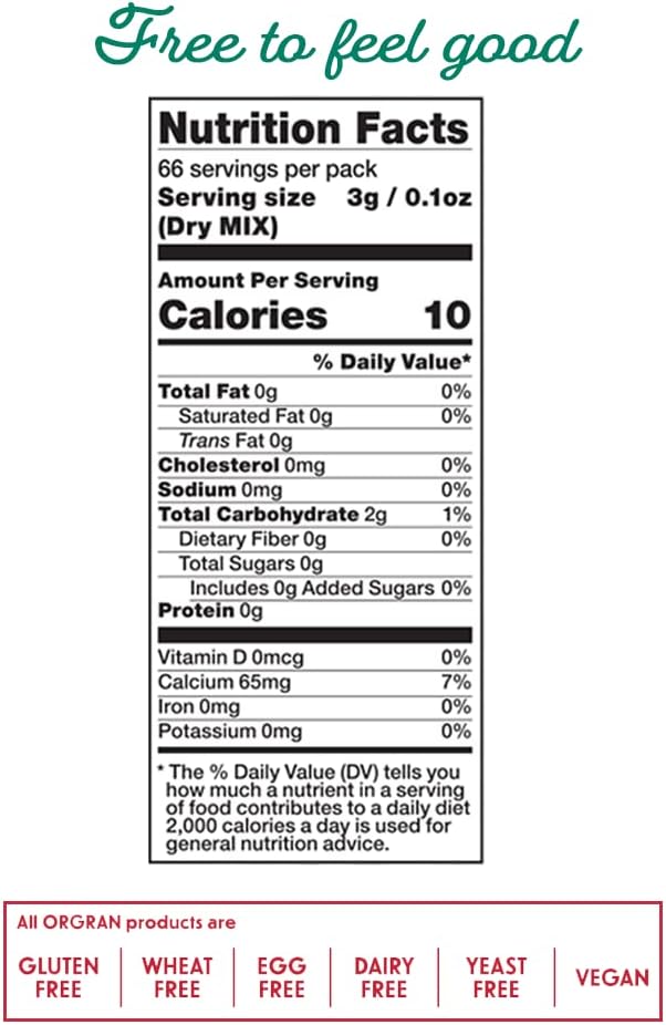 Product Description Orgran No Egg⢠Egg Replacer is a useful and convenient egg substitute containing no cholesterol, no lactose and no egg or animal derived ingredients. This product is versatile in its application as it functions as a binder and thickener in much the same way as eggs do. It can be used in biscuits, pancakes, cakes and waffles. It is also suitable for making egg free custard, cream fillings, egg free mayonnaise and is superb in a gluten free batter mix. The trusted name since 1953 Orgran is a leading brand and trusted name in naturally gluten free nutritious food. You can be safe in the knowledge that no artificial colours, flavours or preservatives have been added to this product. More than 80 natural products. The trusted name in more than 50 countries. You can be safe in the knowledge that no artificial colours, flavours or preservatives have been added to this product Animal derivative free Ingredients Potato Starch, Tapioca Flour, Calcium Carbonate, Citric Acid, Vegetable Gum (Stabiliser): Methylcellulose Allergy Information: Free From Gluten, Free From Wheat, Free From Eggs, Free From Milk, Free From Dairy, Free From Soya\Soybeans P.when('A').execute(function(A) { A.on('a:expander:toggle_description:toggle:collapse', function(data) { window.scroll(0, data.expander.$expander[0].offsetTop-100); }); }); Directions Directions: For 1 whole egg, add 1 teaspoon of Orgran No Eggâ˘, to 2 tablespoon water. To replace 3 egg whites, add 2 teaspoons of Orgran No Eggâ˘, with 1 tablespoon water. (If recipe calls for stiffly beaten egg whites, mix Orgran No Eggâ˘, and water until stiff.) *May also be added directly as a dry ingredient in most recipes. 1 Heaped Teaspoon of No Egg⢠is Equal to 3.0g (0.01 OZ) Safety Warning Always read the ingredients label on the pack before use as this contains the most up to date and relevant information. Box Contains Each order comes with a pack of 8, 200g - Egg Replacer See more,Equal to 66 eggs,Ideal for baking , fillings, batter & custards,Soy, gluten, wheat, dairy, milk, egg, animal derivatives and yeast free,Suitable for vegetarians and vegans,Kosher-Parve - Melbourne Kashrut Australia