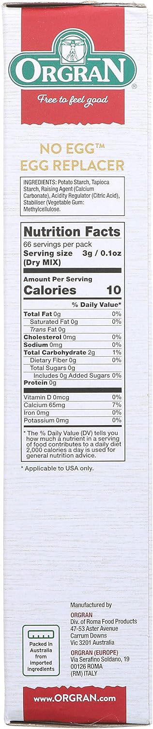 Product Description Orgran No Egg contains no cholesterol, no lactose and no egg. It can be used in cakes, meringues or to make egg free mayonnaise. It is also great as a pantry fill as each packet has the equivalent of 33 eggs. You'll never run out of eggs again. Ingredients Potato Starch, Tapioca Starch, Raising Agent: Calcium Carbonate, Acidity Regulator: Citric Acid, Vegetable Gum (Stabiliser): Methylcellulose P.when('A').execute(function(A) { A.on('a:expander:toggle_description:toggle:collapse', function(data) { window.scroll(0, data.expander.$expander[0].offsetTop-100); }); }); Manufacturer Contact Information Orgran Health & Nutrition, Div. of Roma Food Products, 47 - 53 Aster Avenue, Carrum Downs, Vic 3201, Australia. Orgran (Europe), Via Serafino Soldano, 19 00126 Roma (RM), Italy. See more,It can be used in cakes meringues or to make egg freemayonnaise,It is also great as a pantry fill as each packet has the equivalent of 33 eggs,It contains no cholesterol no lactose and no egg,Gluten free, dairy free, egg free,Suitable for vegetarians