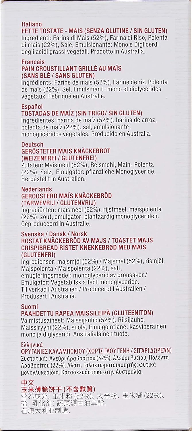Product description Gluten free crispbreads Ingredients maize flour (52%), rice flour, maize polenta (22%),salt, emulsifier (monoglyceride from vegetable),Orgran Toasted Corn Crispbread 125g