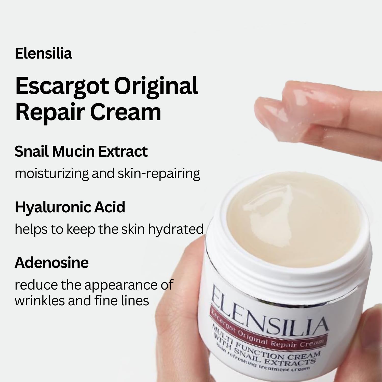 About this item [Experience the ultimate rejuvenation]: This anti-aging face moisturizer is made with 80% French Snail Mucin, not just an extract, to provide deep hydration and firm, plumped, and dewy skin. [Elensilia Escargot Snail Repair Cream]: is clinically tested and proven to provide anti-aging benefits from the Korean Journal of Dermatology. The lightweight, gel-type face cream repairs, hydrates, soothes, and rejuvenates dry, dehydrated, aging, and mature skin types. [80% French Snail Mucin]: a natural ingredient that is rich in antioxidants, vitamins, and peptides that help repair and protect the skin from damage. It also contains 80% glycosaminoglycans that are super high in collagen and elastin, providing deep and long-lasting hydration. After cleansing and toning, apply an appropriate amount of Elensilia Escargot Snail Repair Cream onto your face and neck. Gently massage the cream into your skin using upward and outward motions until fully absorbed. Use it as the last step of your skincare routine both in the morning and evening. [SNAIL-FRIENDLY]: No snails are harmed while collecting Snail Mucin in France--it is safe and environmentally friendly for snails. See more product details,[Experience the ultimate rejuvenation]: This anti-aging face moisturizer is made with 80% French Snail Mucin, not just an extract, to provide deep hydration and firm, plumped, and dewy skin,[Elensilia Escargot Snail Repair Cream]: is clinically tested and proven to provide anti-aging benefits from the Korean Journal of Dermatology. The lightweight, gel-type face cream repairs, hydrates, soothes, and rejuvenates dry, dehydrated, aging, and mature skin types,[80% French Snail Mucin]: a natural ingredient that is rich in antioxidants, vitamins, and peptides that help repair and protect the skin from damage. It also contains 80% glycosaminoglycans that are super high in collagen and elastin, providing deep and long-lasting hydration,After cleansing and toning, apply an appropriate amount of Elensilia Escargot Snail Repair Cream onto your face and neck. Gently massage the cream into your skin using upward and outward motions until fully absorbed. Use it as the last step of your skincare routine both in the morning and evening,[SNAIL-FRIENDLY]: No snails are harmed while collecting Snail Mucin in France--it is safe and environmentally friendly for snails