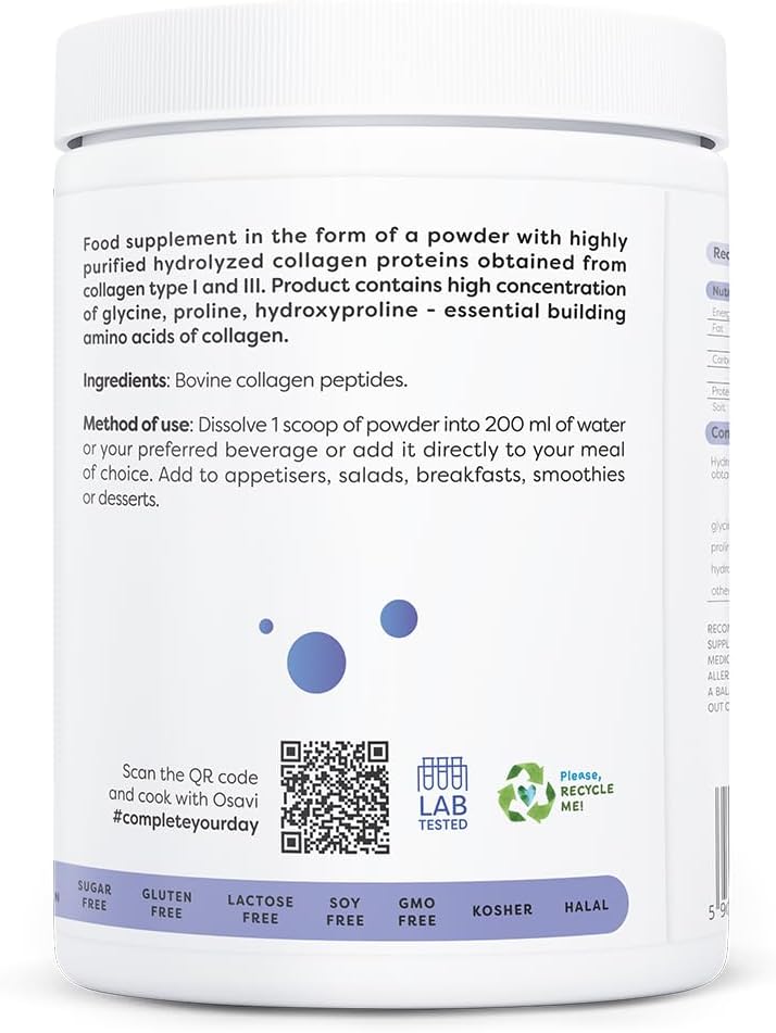 Osavi Collagen Peptides, Hydrolyzed Type 1 & 3 β Powder 300G | 20G Collagen Per Serving | 18 Amino Acids, Including Glycine, Proline | Supports Muscles And Bones | Neutral Taste | Easily Soluble