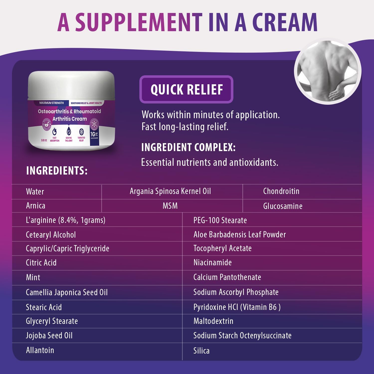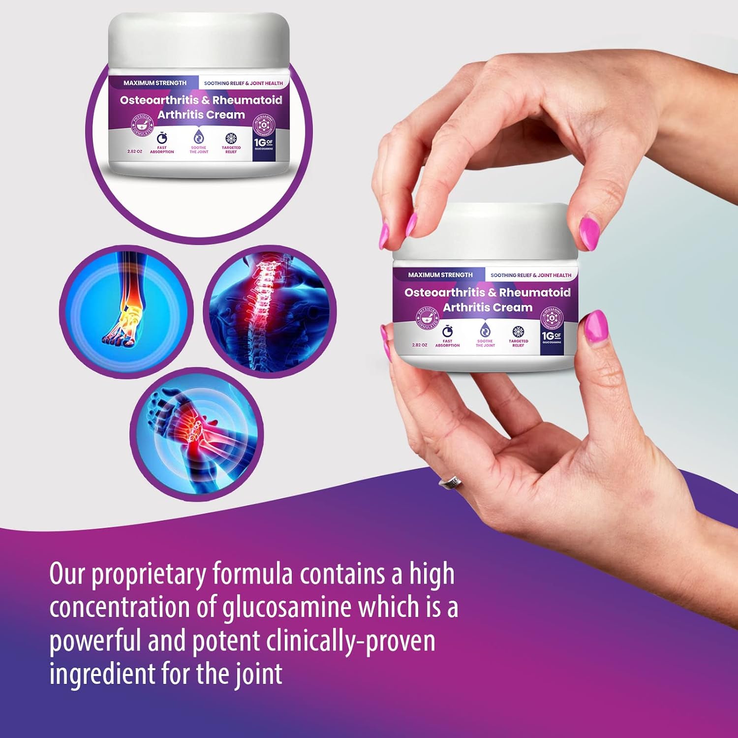About this item Targets the joint to deliver the key ingredients necessary. Works within minutes of application. Our proprietary formula can help to soothe the area. Highly effective in providing long lasting relief. Highly Concentrated formula contains a high concentration of Glucosamine which is a powerful and potent clinically-proven ingredient. Superior Absorption: Absorbs quickly, and can be used to provide targeted relief to other body parts such as your back, neck, knee, hip, shoulders, elbows, joints and muscles. Helps with supporting the body’s processes. Doctor formulated: Expertly formulated to sooth and cool See more product details,Targets the joint to deliver the key ingredients necessary. Works within minutes of application. Our proprietary formula can help to soothe the area,Highly effective in providing long lasting relief,Highly Concentrated formula contains a high concentration of Glucosamine which is a powerful and potent clinically-proven ingredient,Superior Absorption: Absorbs quickly, and can be used to provide targeted relief to other body parts such as your back, neck, knee, hip, shoulders, elbows, joints and muscles. Helps with supporting the body’s processes,Doctor formulated: Expertly formulated to sooth and cool