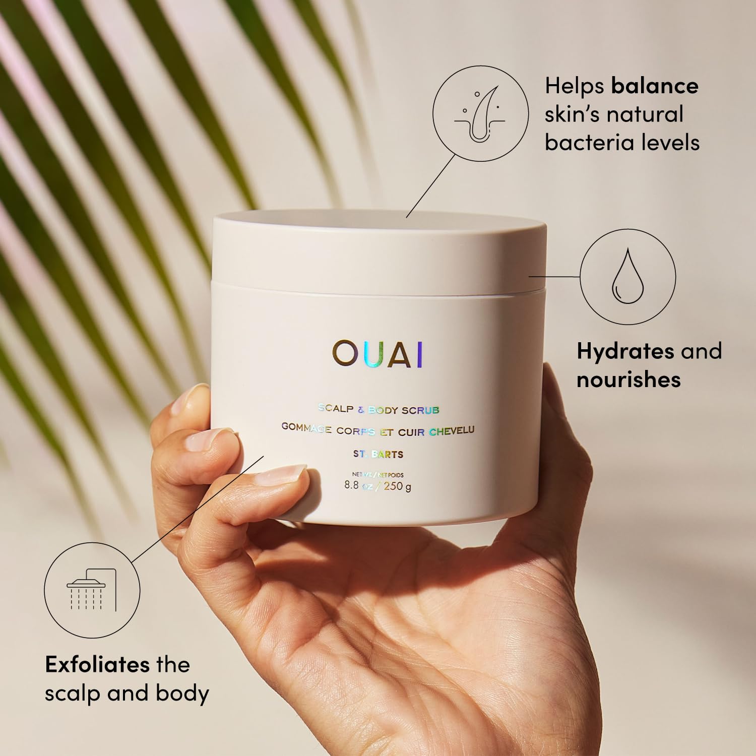 Exfoliating Scalp & Body Sugar Scrub - This rose-scented exfoliating scrub gently removes product buildup from your scalp and boy while softening and balancing your skin's moisture levelScrub It All A-OUAI - Give your body and scalp care routine an instant level-up with this clarifying scrub. Formulated with sugar crystals to gently exfoliate & remove buildup and coconut oil, which is rich in fatty acids, to help nourish your skinOUAI Means Yes - In that casual Parisian way. OUAI is about being better IRL. It's about having honest conversations with our community. It's about letting go of unrealistic expectations and embracing your imperfectionsMade For Effortless Routines - All OUAI products including this dual body exfoliator and scalp scrub are carefully crafted to nourish and enhance your body care experience. We put the good stuff in and leave the bad stuff out, without ever sacrificing quality