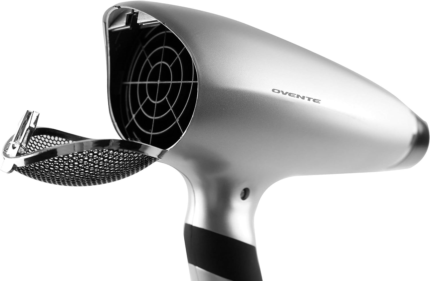 Lightweight For Everyday Use –Built with a 1875 watt motor, has 2 Speed & 3 Heat Settings for customizable usage. Cool Shot button is to set your hair, seal cuticle and prevent frizz! 1.55 lbs1 Wide Concentrator Nozzle – Features one wide nozzle that helps to dry hair more quickly and smooth cuticleIonic & Tourmaline Technology –Emits negative ions that help break down water molecules in your hair that removes frizz, makes hair smooth, shiny and more hydrated & conditionedRemovable Filter, Storage Hook & Travel Bag - Remove build-up of hair and dust with easy removeable filter, and hang your hair dryer for convenient storage. Comes with a travel bag to protect while on the go. ALCI Plug for all day useUS-based Customer Service: Ovente warranties that the product shall be free from defects in material & workmanship under normal use & conditions, for 1 year from the original purchase dateOvente hair dryers are not only powerful but also sleek in design and very versatile. The Ovente professional hair dryers have multiple features that makes the hair shiny and healthy in no time: ceramic coating which has a heat control technology that distributes the heat evenly, and minimizes heat damage, and dries the hair faster. Ionic helps the hair break down water molecules it neutralizes positive (+) ions in the hair, reducing frizz and restoring glow which makes the hair looking conditioned every day. Tourmaline technology emits negative (-) ions that transforms the hair into its shiny state. It has a gemstone coating that helps smoothen the hair by sealing the cuticle and remaining moisture for frizz-free hair. The hair dryer is powered by a built-in weight balanced AC motor for a more powerful and long-lasting hair dryer – perfectly suitable for hair stylists. Ergonomic and lightweight design for comfortability while using in salon or at home use. 2 speed and 3 heat settings that suits your needs: low heat setting is suitable for fine, thin hair while high heat setting is perfect for thick, coarse hair. The cool shot button seals the hair cuticles to set your hair making it shinier and long-lasting. Comes with ALCI safety plug which has a ground-fault interrupter built inside for preventing electric shock. Comes with convenient hook for storage and removable filter for easy cleaning. Travel Bag included to protect your hair dryer on the go!