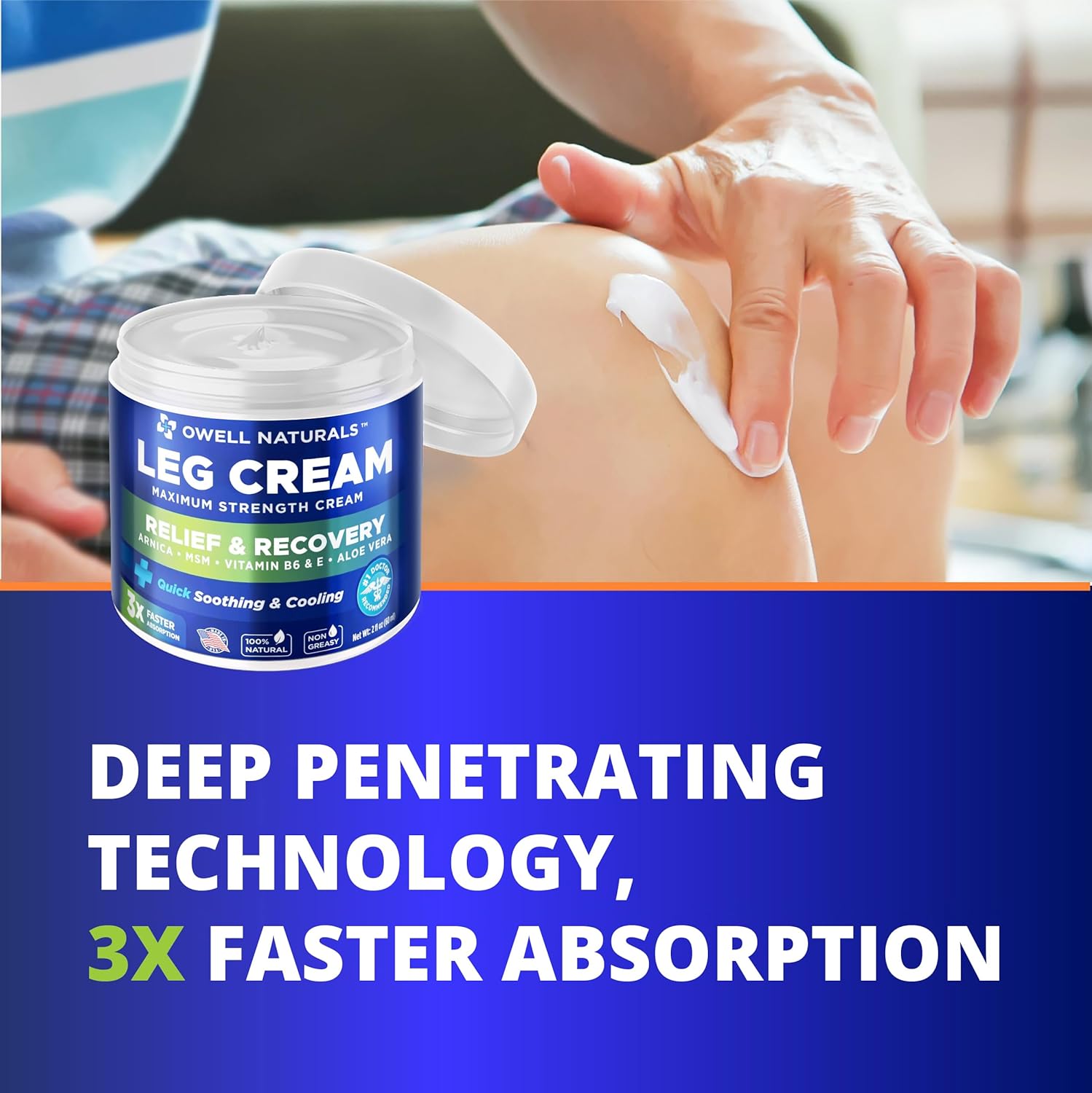 Our leg cream provides immediate relief from muscle fatigue, cramps, and discomfort, helping you feel rejuvenated and refreshedCooling Sensation: The unique cooling formula soothes and calms the skin, leaving a refreshing sensation and promoting relaxationMoisturizing and Nourishing: Enriched with nourishing ingredients, our leg cream deeply moisturizes the skin, promoting smoothness and enhancing overall leg healthFast Absorption: The lightweight and non-greasy formula absorbs quickly, allowing for hassle-free application and leaving no residue behindNatural Ingredients: Formulated with a blend of natural botanical extracts, vitamins, and essential oils known for their beneficial properties on leg wellnessLeg Cream Relief Cream - Fast-Acting Maximum Strength Formula