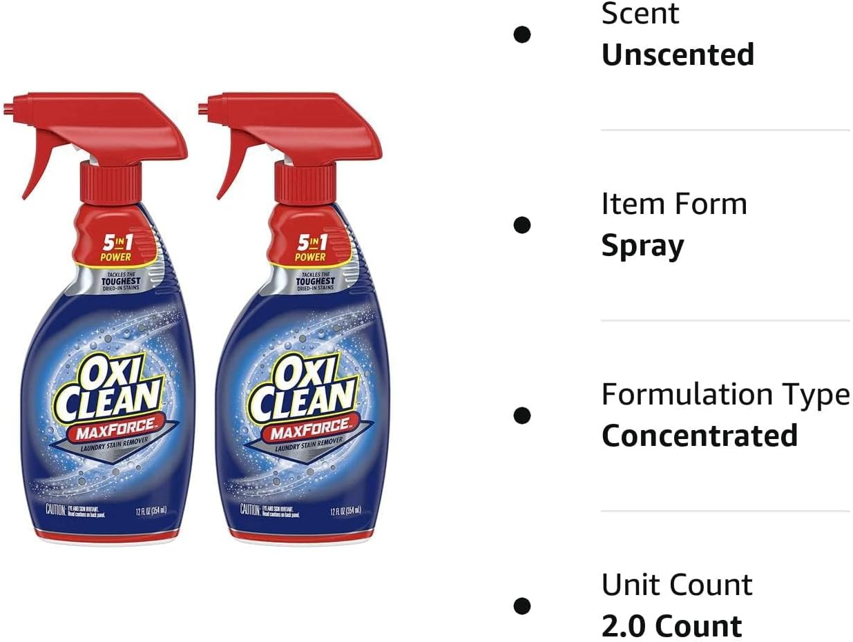 IN THE BOX: 2 OxiClean Max Force Spray, 1 Laundry Stain Remover Brush10GREAT STAIN REMOVER : Removes a wide variety of stains, including grass, blood, ink, wine, food, grease, oil, dirt, and mud10VARIETY OF FABRICS : Great for use on most fabrics, including delicates10EVEN MORE POWER : Concentrated formula that works quickly and effectively10ULTIMATE STAIN REMOVER TOOL : Comes with an ONDAGO Laundry Stain Brush for scrubbing out tough stains