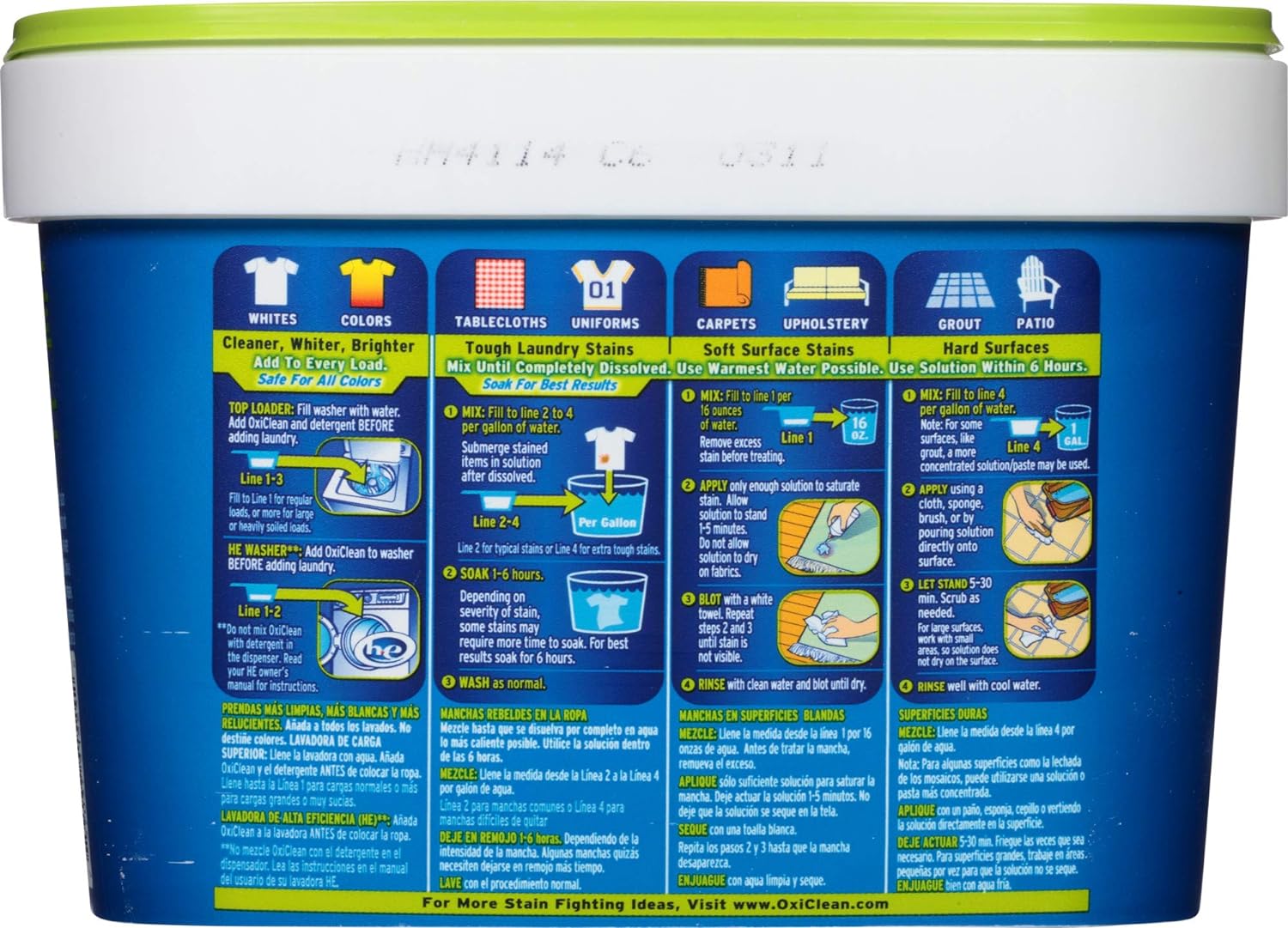 Four 3 lb. box of OxiClean Versatile Stain Remover Free10Oxygen-based, water-activated formula gets out tough dirt, persistent spots and set-in stains10Works with regular detergent to get clothes extra clean and works on carpets, upholstery and nearly any surface in your home10Free of any irritating dyes and perfumes10Chlorine-free and color safe formula