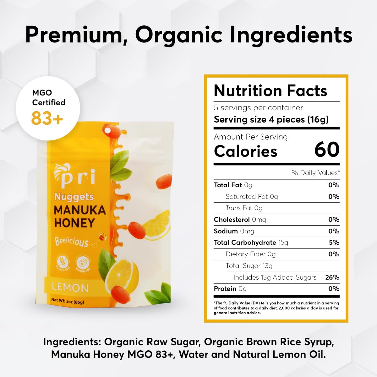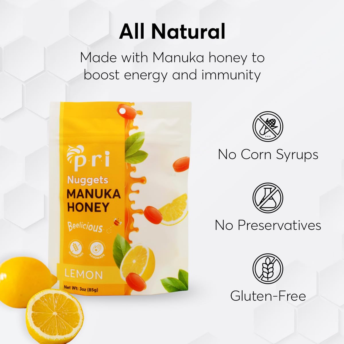 About this item DELICIOUS AND SATISFYING: Satisfy your sweet tooth with our tasty lemon-flavored Manuka Honey Nuggets. These flavorful nuggets contain energy and immunity boosting manuka honey! ALL NATURAL INGREDIENTS: Using premium New Zealand manuka honey, we use only the best ingredients. No corn syrup. No artificial ingredients, flavorings, fillers or binders. Naturally without gluten, soy, dairy and dyes. CONTAINS PURE MANUKA HONEY: Raw manuka honey is great for immune system support and is proven to have superior wellness benefits over regular honey. We use only premium New Zealand MGO 83+ manuka honey in our treats. CONVENIENTLY INDIVIDUALLY WRAPPED: Easy to take with you on-the-go or to pour into a shareable candy bowl, these sweet treats are individually wrapped and a perfect anytime treat. PRI INDUSTRY LEADERSHIP: As the first to bring manuka honey to the US, we continue our tradition of providing premium, authentic manuka honey products (raw honey, health aids, skincare, treats) from sustainable beekeepers. We proudly donate a portion of every purchase to bee-sustainability. See more product details,DELICIOUS AND SATISFYING: Satisfy your sweet tooth with our tasty lemon-flavored Manuka Honey Nuggets. These flavorful nuggets contain energy and immunity boosting manuka honey!,ALL NATURAL INGREDIENTS: Using premium New Zealand manuka honey, we use only the best ingredients. No corn syrup. No artificial ingredients, flavorings, fillers or binders. Naturally without gluten, soy, dairy and dyes,CONTAINS PURE MANUKA HONEY: Raw manuka honey is great for immune system support and is proven to have superior wellness benefits over regular honey. We use only premium New Zealand MGO 83+ manuka honey in our treats,CONVENIENTLY INDIVIDUALLY WRAPPED: Easy to take with you on-the-go or to pour into a shareable candy bowl, these sweet treats are individually wrapped and a perfect anytime treat,PRI INDUSTRY LEADERSHIP: As the first to bring manuka honey to the US, we continue our tradition of providing premium, authentic manuka honey products (raw honey, health aids, skincare, treats) from sustainable beekeepers. We proudly donate a portion of every purchase to bee-sustainability