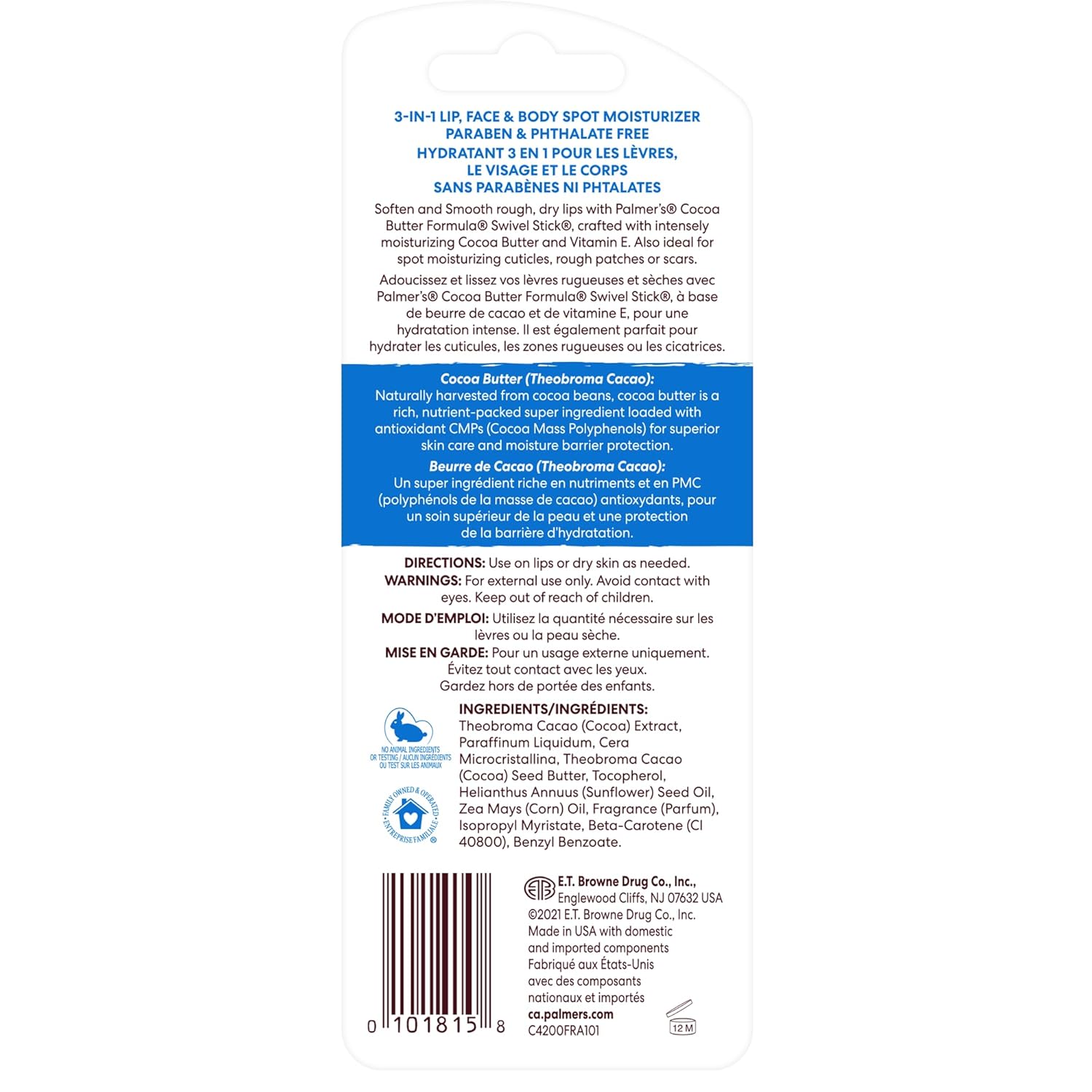 About this item Spot Moisturization Where You Need It: Our cocoa butter formula comes in a convenient Swivel Stick to moisturize dry, chapped lips and treat marks, blemishes, and rough, dry skin anywhere on your body Special Formula: Made with Cocoa Butter to naturally moisturize, Raw Shea Butter for essential fatty acids and nutrients, and Vitamin E to help improve the appearance of scars, stretch marks and skin imperfections; Features a light cocoa scent Finest Ingredients: We strive to use only the finest natural, raw ingredients to bring you soft, hydrated and beautiful hair and skin; We support sustainable production of Shea and Cocoa Butter and Coconut Oil worldwide Choose What's Real: Our beauty products and hair and skin treatments feature real high quality, plant based ingredients in formulas that really work to hydrate and soften, from lip balm to bar soap to body butter Palmer's Skin Care: Our Cocoa Butter, Coconut Oil, Shea Butter, Olive Oil, and Vitamin E product lines include creams, balms, lotions, oils and soaps for hand and body, face, lip, sun care, hair care and pregnancy and stretch mark care See more product details,Spot Moisturization Where You Need It: Our cocoa butter formula comes in a convenient Swivel Stick to moisturize dry, chapped lips and treat marks, blemishes, and rough, dry skin anywhere on your body,Special Formula: Made with Cocoa Butter to naturally moisturize, Raw Shea Butter for essential fatty acids and nutrients, and Vitamin E to help improve the appearance of scars, stretch marks and skin imperfections; Features a light cocoa scent,Finest Ingredients: We strive to use only the finest natural, raw ingredients to bring you soft, hydrated and beautiful hair and skin; We support sustainable production of Shea and Cocoa Butter and Coconut Oil worldwide,Choose What's Real: Our beauty products and hair and skin treatments feature real high quality, plant based ingredients in formulas that really work to hydrate and soften, from lip balm to bar soap to body butter,Palmer's Skin Care: Our Cocoa Butter, Coconut Oil, Shea Butter, Olive Oil, and Vitamin E product lines include creams, balms, lotions, oils and soaps for hand and body, face, lip, sun care, hair care and pregnancy and stretch mark care