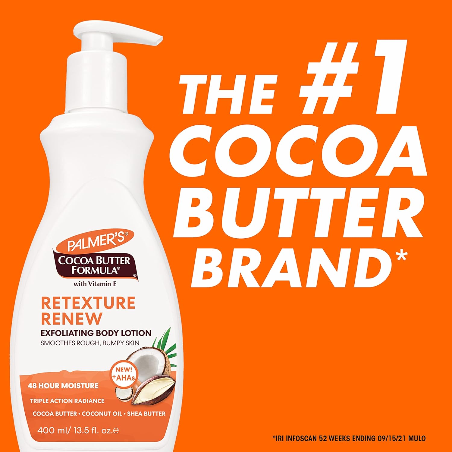 Exfoliating Lotion: This body lotion smoothes and softens rough, bumpy skin with AHAs, Lactic Acid and a natural blend of Cocoa Butter, Coconut Oil, Shea Butter and Vitamin ESmoothe and Soften: Perfect for areas prone to bumpiness such as upper arms, outer thighs or buttocks, this dermatologist tested exfoliating lotion provides 48 hour moisture; Vegan friendly with no parabens or phthalatesFinest Ingredients: We strive to use only the finest natural, raw ingredients to bring you soft, hydrated and beautiful hair and skin; We support sustainable production of Shea and Cocoa Butter and Coconut Oil worldwideChoose What's Real: Our beauty products and hair and skin treatments feature real, plant based ingredients in formulas that really work to hydrate and soften, from lip balm to bar soap to body butterPalmer's: Our Cocoa Butter, Coconut Oil, Shea Butter, Olive Oil, and Vitamin E product lines include creams, balms, lotions, oils and soaps plus face, lip, and hair care, pregnancy and stretch mark careSmooth and Soften rough, bumpy skin with Palmer's Cocoa Butter Formula Retexure & Renew Exfoliating Body Lotion, crafted with AHAs and a Triple Blend of Radiance Activating Moisturizers Cocoa Butter, Coconut Oil and Shea Butter to exfoliate dead skin cells and smooth bumpy skin