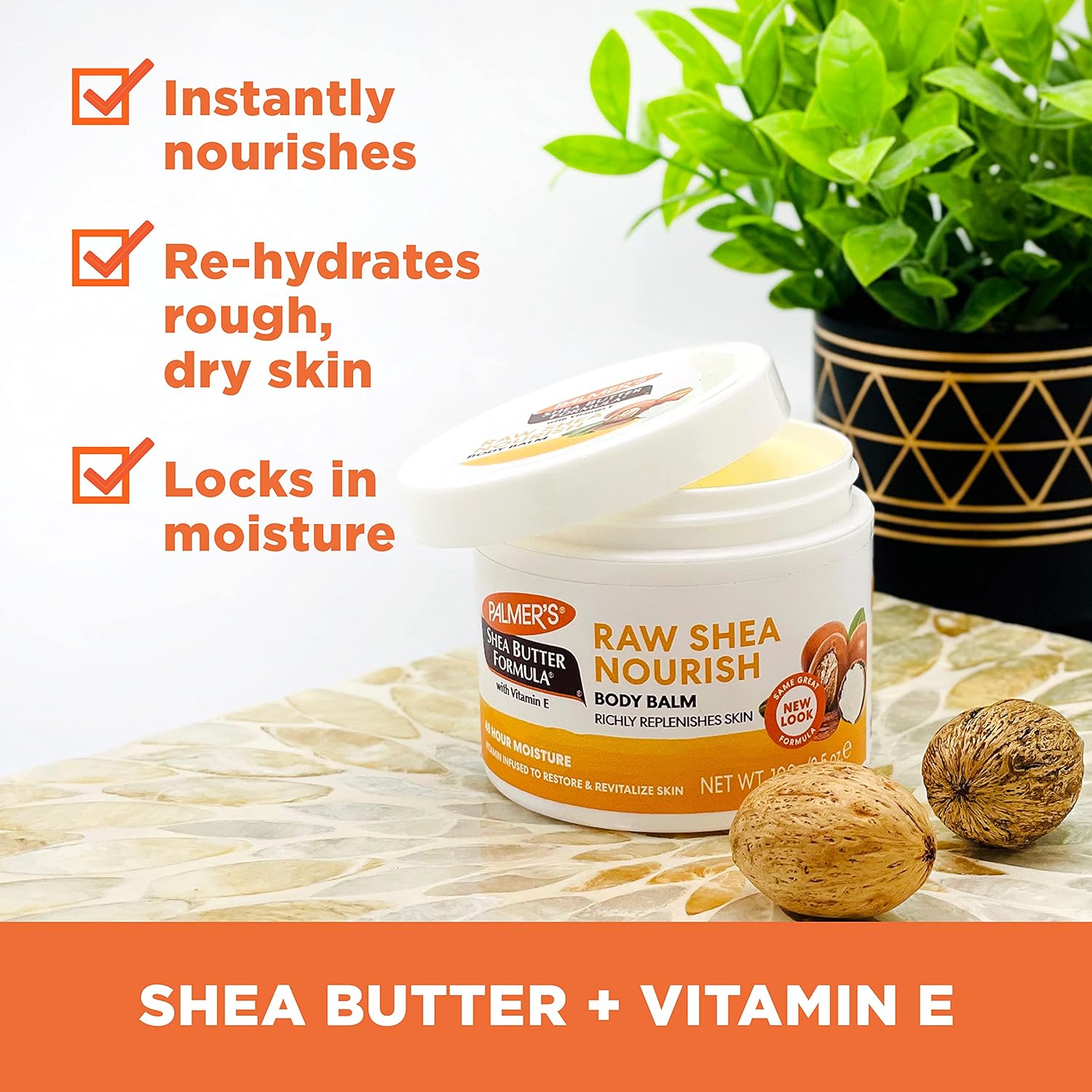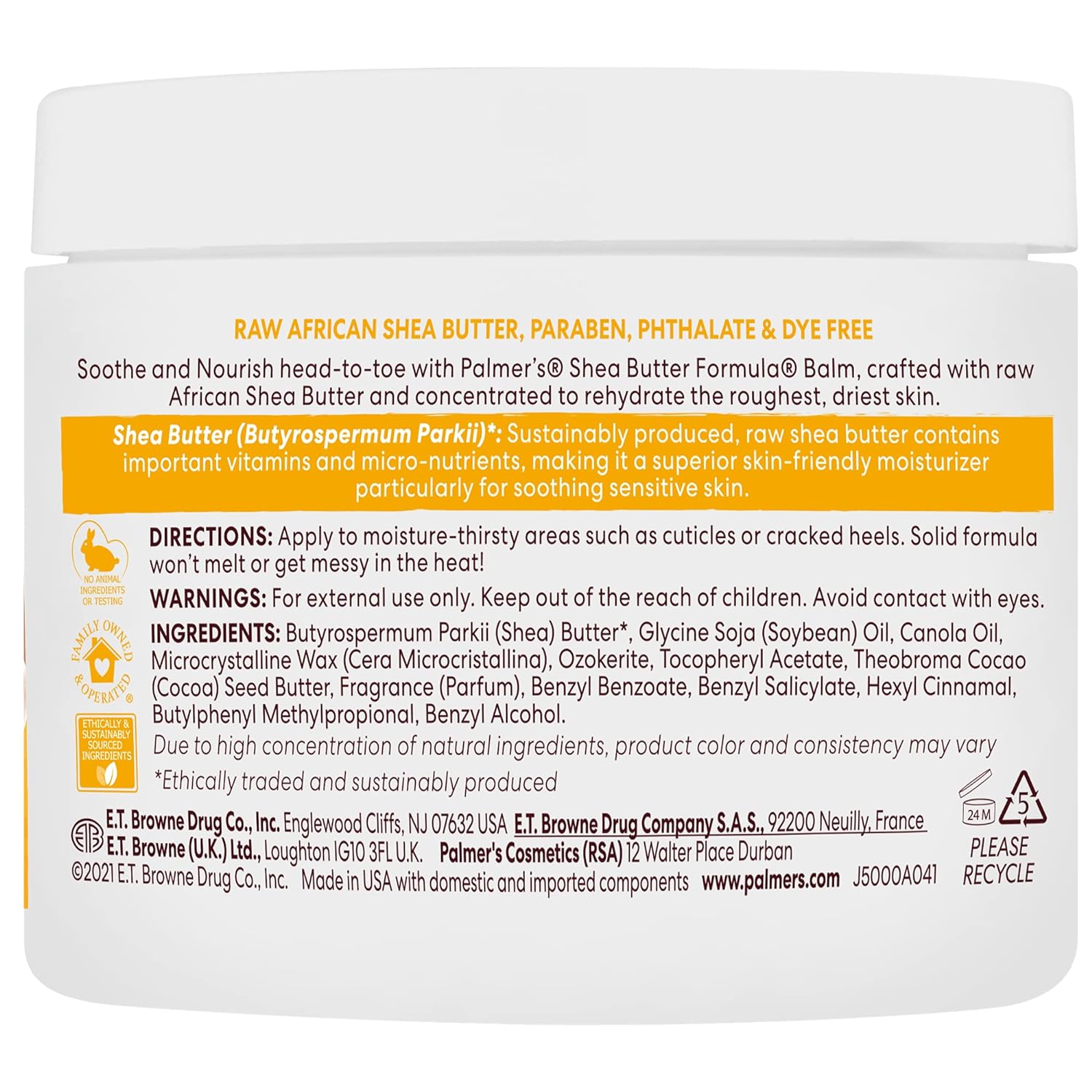 Shea Balm: This moisturizing balm melts into a non greasy body oil on contact with skin; Great for dry, damaged skin, this balm instantly softens even the roughest areas such as elbows and feet; Provides 24 hour moistureNatural Factors: Shea Butter deeply nourishes and softens skin, Cocoa Butter improves tone and texture and Soybean Oil helps prevent skin dehydration and adds a protective moisture barrier all over the skinFinest Ingredients: We strive to use only the finest natural, raw ingredients to bring you soft, hydrated and beautiful hair and skin; We support sustainable production of Shea and Cocoa Butter and Coconut Oil worldwideChoose What's Real: Our beauty products and hair and skin treatments feature real high quality, plant based ingredients in formulas that really work to hydrate and soften, from lip balm to bar soap to body butterPalmer's Skin Care: Our Cocoa Butter, Coconut Oil, Shea Butter, Olive Oil, and Vitamin E product lines include creams, balms, lotions, oils and soaps for hand and body, face, lip, sun care, hair care and pregnancy and stretch mark careWhen choosing skincare, long lists of ingredients can be daunting to read and understand, making it difficult to decide which natural skincare products are right for you based on their ingredients. Cocoa Butter, Shea Butter, and Coconut Oil are some of the natural ingredients for skin you may see in your products, but how do you know which natural skincare ingredients are best for you When it comes to Shea Butter, it's known as one of the best natural skincare ingredients. Due to the vitamins and fatty acids, shea butter delivers nourishing properties with rich moisturization lasting up to 48 hours. it's known for being gentle and is ideal for sensitive skin. Palmerās Raw Shea Body Balm is great for extra dry areas such as elbows and feet