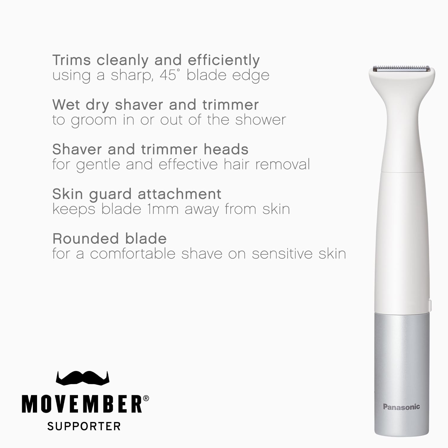 2-in-1 Bikini Trimmer and Bikini Shaver: Made just for the bikini area, the Panasonic ES-WV60-S allows you to shave, trim or shapeGentle Blades for Safe Grooming: Trimmer blades uses rounded edge to be extra-gentle on skin, and trimmer blades shaver foils are made using hypoallergenic stainless steel, for a comfortable trim or shave even on sensitive skinFour Attachments: Dedicated shaver and trimmer heads let you keep yourself well-groomed however you want; bikini comb trims thicker hair; skin guard attachment keeps trimmer blade 1mm from skin, ensuring safety while groomingWet or Dry Convenience: Waterproof womens bikini trimmer allows you to groom wet, in the shower or bath, or dry, anytimePerfectly Portable: Small, cordless design packs neatly in makeup bag for travel; no need to worry about chargers, this bikini line trimmer operates on 1-AA battery (not included)Made just for the bikini area, the Panasonic Bikini Trimmer and Shaver, ES-WV60-S, provides gentle trimming and shaving in sensitive areas. Four included attachments, including a Bikini Trimmer Head, Foil Shaver Head, Bikini Comb and Skin Guard, have been designed to gently remove hair in the bikini area, allowing you to groom even hard-to-reach places. Trimmer blade uses rounded edges to provide maximum comfort, even on sensitive skin. The women’s shaver and bikini trimmer has a waterproof body and it can be use wet, in the bath or shower, or dry anytime. Cordless and battery-operated (not included), the bikini shaver has a compact design that packs away neatly in makeup bags for use while travelling