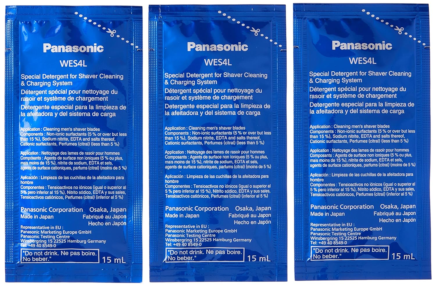 Panasonic cleaning detergent refill is compatible with the Clean & Charge Systems for the following Panasonic Shaver Models: ES-LV9N-S, ES-LV97-K, ES-LV95-S, ES-LT7N-SFresh-scent cleaning solution will help keep blades clean, stubble-free and at-the-ready for your next shaveTo use, fill cleaning station with detergent solution and add warm waterIncludes 3 individual packs of detergent solution; Solution should be changed out once every six months, depending on frequency of useDETERGENT & CHARGING SYSTEM