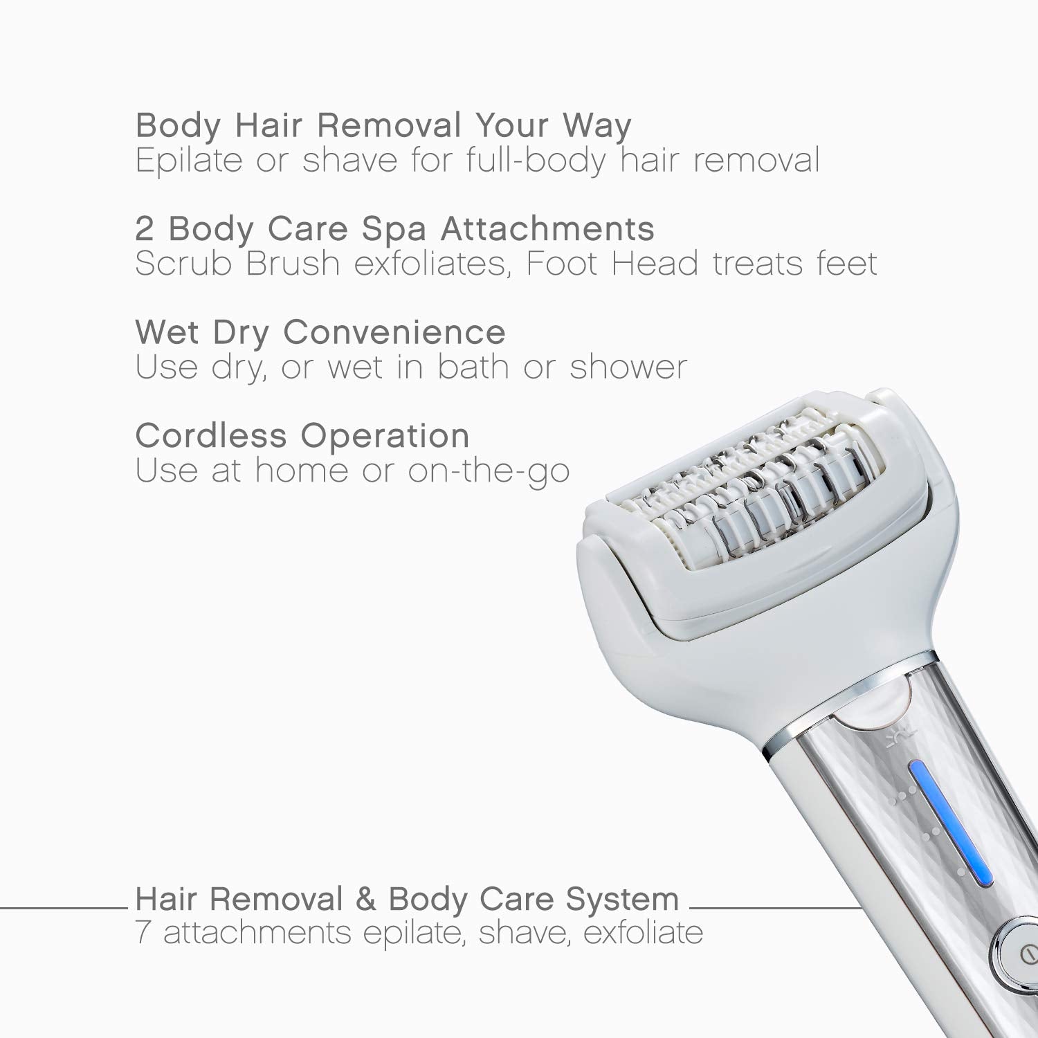 SEVEN SNAP ON ATTACHMENTS: For hair removal and spa-like body care include Epilator Head, Gentle Epilator Cap, Sensitive Skin Epilator Cap, Shaver Head with Precision Pop-up Trimmer, Bikini Comb, Sonic Scrub Brush and Foot Care BufferQUICK HAIR REMOVAL: Is efficient with a wide 1.25 inches. dual disc epilation head with 60 hypoallergenic, rotating tweezers that remove hair often too short to wax, as short as 0.5 millimeterEASY CORDLESS EPILATION: For hard to reach areas, a 90 degree pivoting epilator head closely moves along the contours of your body; a cordless design makes it easy to use the epilator anytime, anywhereWET DRY SHAVING & EPILATION: A sleek, waterproof wet dry design makes it easy to remove hair in the bath or shower, or dry anytime. For gentler, smoother epilation simply apply bath gel to the epilator head to create a rich, soothing foamVERSATILE BEAUTY TOOL: Includes a sure-grip handle, three speed settings, a bright LED, cleaning brush and travel/storage pouchThe Panasonic ES-EL9A-S epilator and shaver provides easy, full-body hair removal and spa-like beauty body care at home. It uses seven different attachments to epilate, shave and trim, exfoliate and soften feet. Attachments include an epilation head for legs and arms; gentle cap for gentler epilation; sensitive area cap for underarms and bikini line; shaver head with slide-up trimmer; bikini comb attachment; foot care head to remove calluses and dead skin; and sonic scrub brush for exfoliation. The main epilator attachment features a 1.25-In. Area of epilation to cover a large surface area to efficiently capture and remove body hair from the root. Inside the head, rotating double discs with 60 hypoallergenic tweezers work in tandem to ensure hair not captured by the first disc is caught and removed by the second - even single stray hairs and hair often too short for waxing, as short as 0.5mm. A highly flexible 90 pivoting epilator head smoothly adjusts to your natural contours to remove hair from underarms, knees and other hard-to-reach places. This waterproof cordless wet dry beauty tool is perfect for use in the bath. For a more gentle epilation experience apply gel to the epilator head and turn on to create rich foam which gathers around hairs to help make hair removal easier. For quick trims and touch-ups, use the Panasonic es-el9a dry as a women's shaver or epilator for smooth, beautiful results. For an at-home spa experience, snap on the Sonic scrub brush to cleanse and exfoliate body or use the foot care head to remove dry, callused skin from feet. This versatile beauty tool includes a sure-grip handle to ensure ease and control, three speed settings, A bright LED, cordless operation, cleaning brush and travel/storage pouch. Maintenance is quick and easy. Simply rinse the body and attachments under warm running water to clean. An included AC charger recharges the device in only one hour for 30 minutes of cordless use for personal Care at home and away