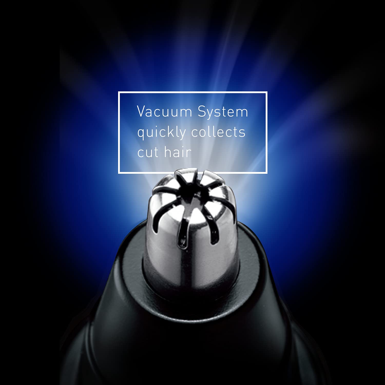 Vacuum system that whisks away hair clippingsUse wet or dry and head is washable for easy maintenance and is fully immersibleEronomic design makes it easy to hold and positionDual-Edge hypo-allergenic 60-degree blade cuts cleanly without pullingOperates on 1 "aa" battery (not included) for 90-minute operation, includes travel pouch and protective coverThe Panasonic er430k vacuum ear/nose trimmer is the ultimate personal grooming tool. Have you ever wondered where hair clippings go after they have been trimmed from your ear or nostrils some fall into the groomer but many remain right where you found them. They can fall out at inappropriate times or be inhaled. The er430k uses a revolutionary vacuum system to whisk away cut hairs so that they remain out of sight. The sleek ergonomic design makes it easy to hold and position. The hypoallergenic blades on the er430k are placed at a 60 degree angle so they cut cleanly and precisely without the pulling that can occur with a duller blade. It equipped comes with a mirrored cap to help locate stray hairs. The head rinses clean under running water. Operates on one double aa battery