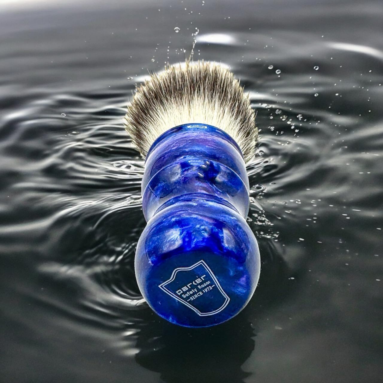 Parker “Blue Storm” Deluxe Synthetic Shaving Brush & Stand – 24 Mm Knot, Iridescent Resin Handle, Ergonomic 122 Mm Length, Handmade With A High Bristle Density For Rich Lather