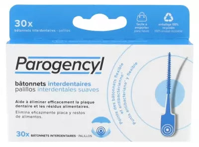 Parogencyl 30 Interdental Sticks Are Sticks That Help Clean In Depth And Gently Remove Dental Plaque In Areas That Are Difficult To Reach With The Toothbrush, Thanks To Its Flexible Rubber Tip. The Rubber Handle Is Flexible For A Good Grip. The Sticks Help Easily Remove Plaque From Hard
