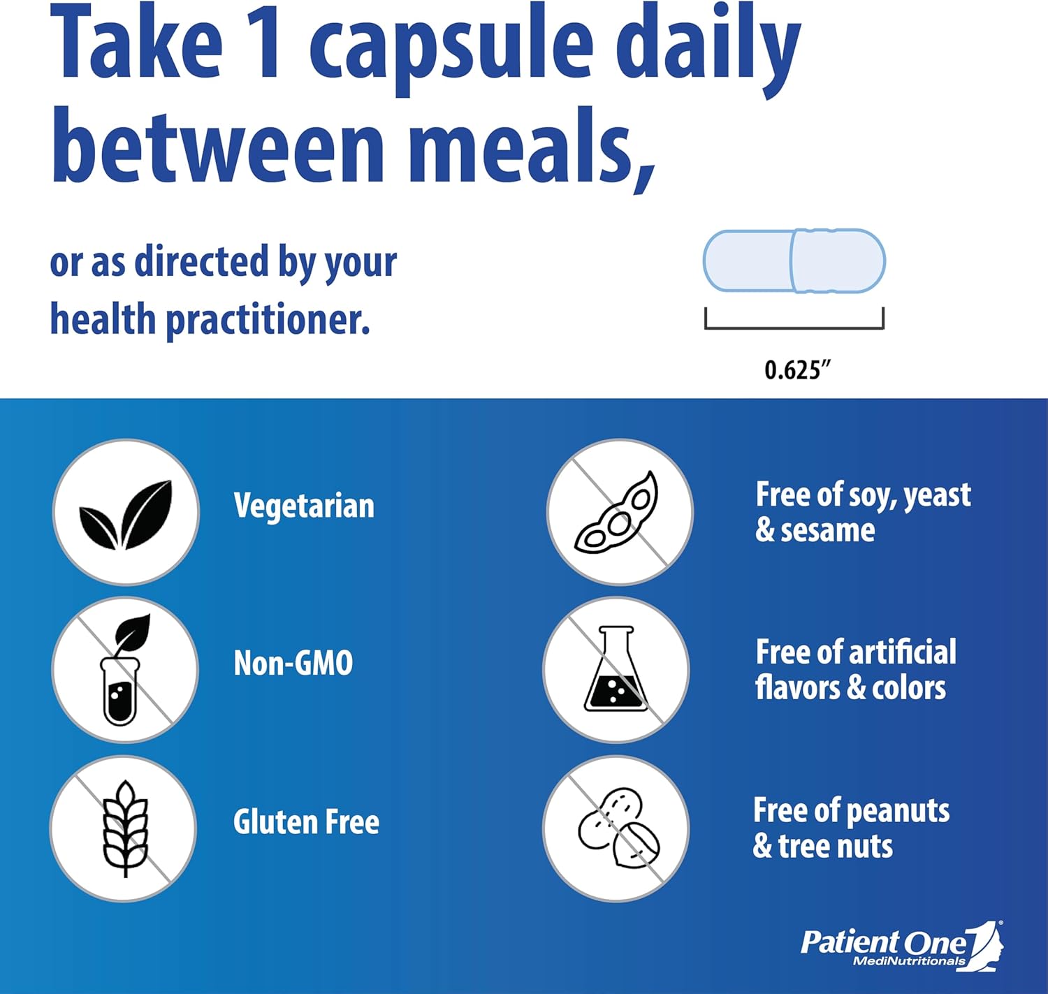 About Patient One: As a leading healthcare professional brand, Patient One is trusted by thousands of practitioners for our premium quality supplements. Our research-driven formulas are made with high quality raw ingredients, manufactured in an NSF-certified, GMP facility to stringent quality standards, and rigorously tested at all stages