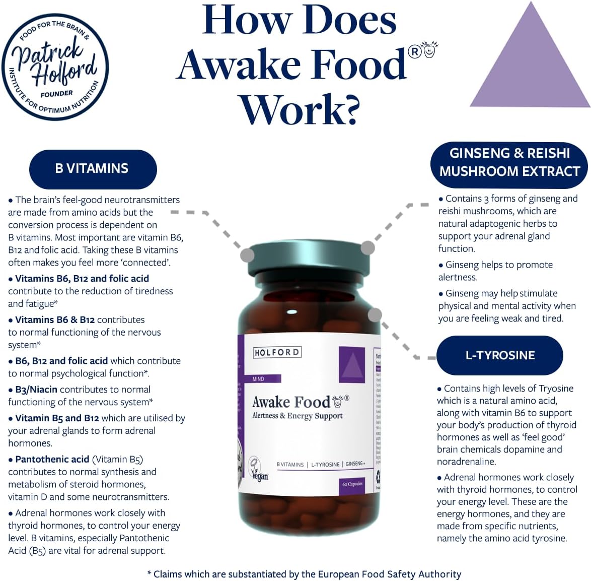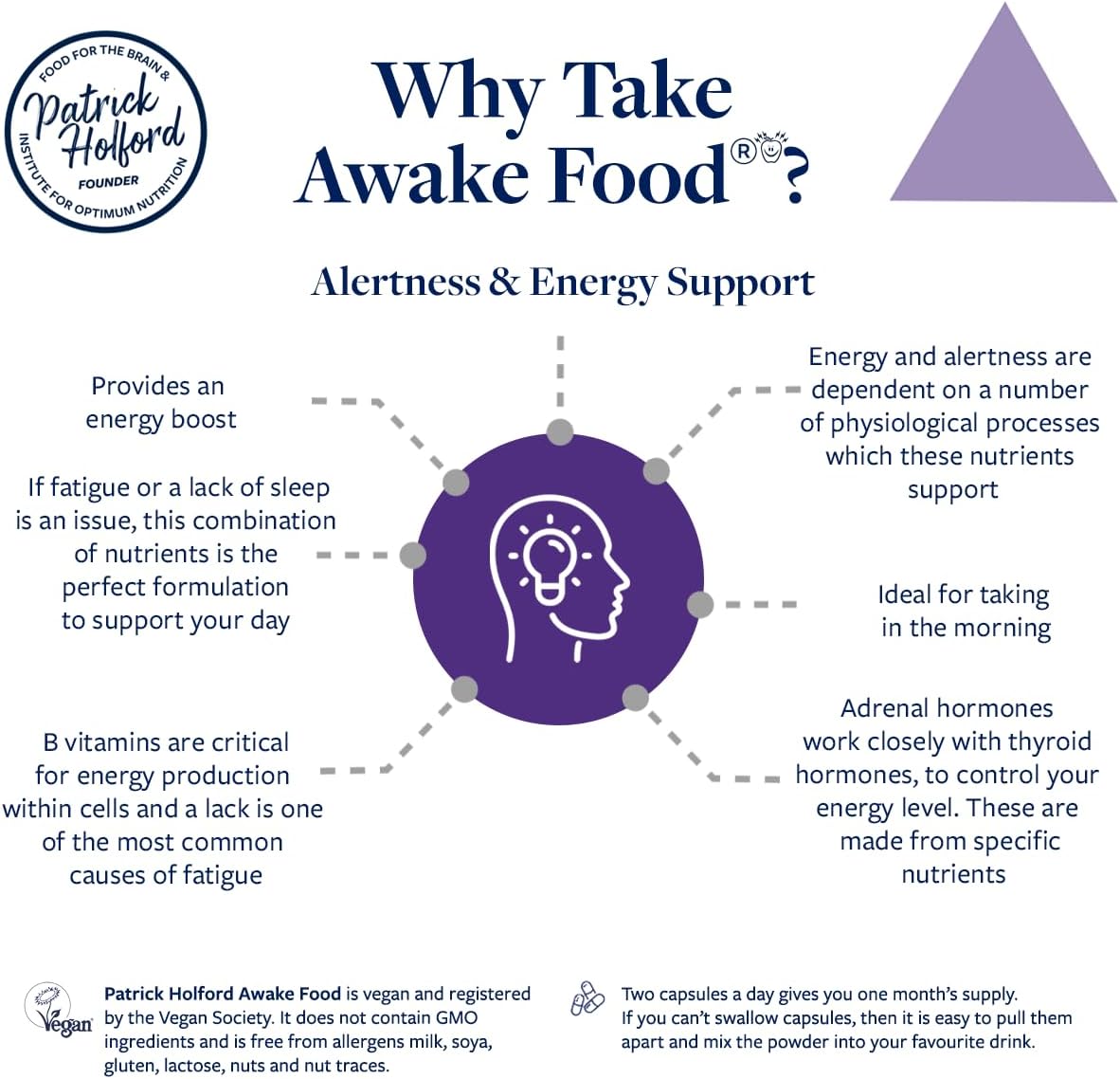 Patrick Holford Awake Food/Brain Supplement/For Alertness & Energy Support / 10 Nutrients/B Vitamins, Tyrosine, Ginseng + / Naturally Sourced / 60 Capsules/Vegan/Women & Men