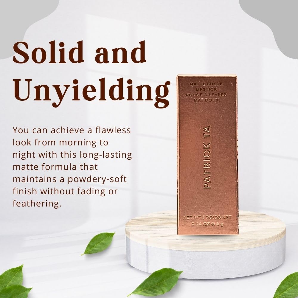 STUNNING: The PATRICK TA Matte Suede Lipstick is fully loaded with ultra-fine spherical pigments that deliver rich, vibrant color in a single swipe, ensuring an even and stunning application every time