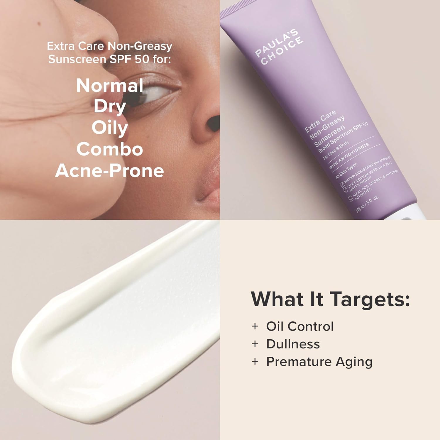 Paula'S Choice Extra Care Non-Greasy Sunscreen Is Water- And Sweat-Resistant; Ideal For Outdoor & Water-Based Activities. This Silky Oil-Free Formula Is Great For All Skin Types Including Oily And Combination Skin. Goes On Smooth & Dries To A Soft Matte Finish