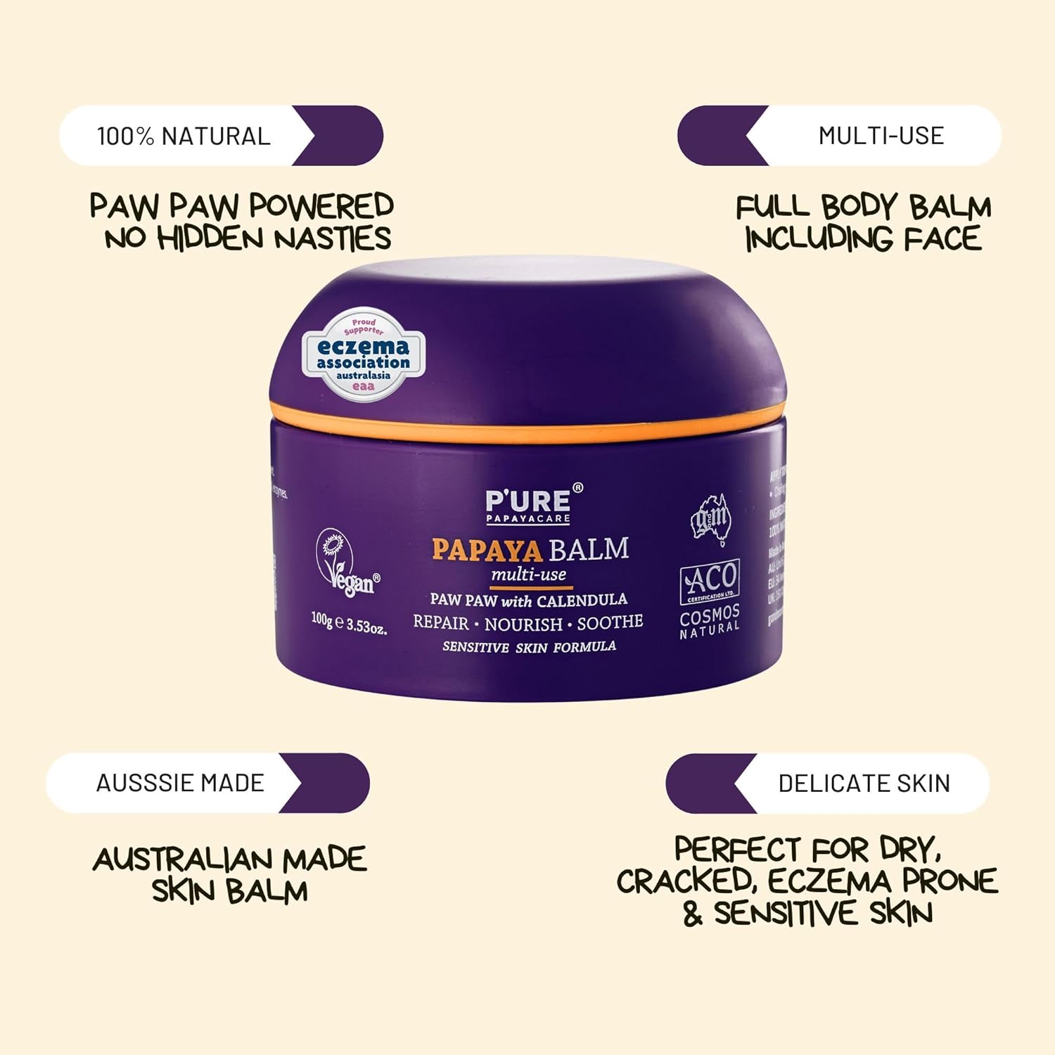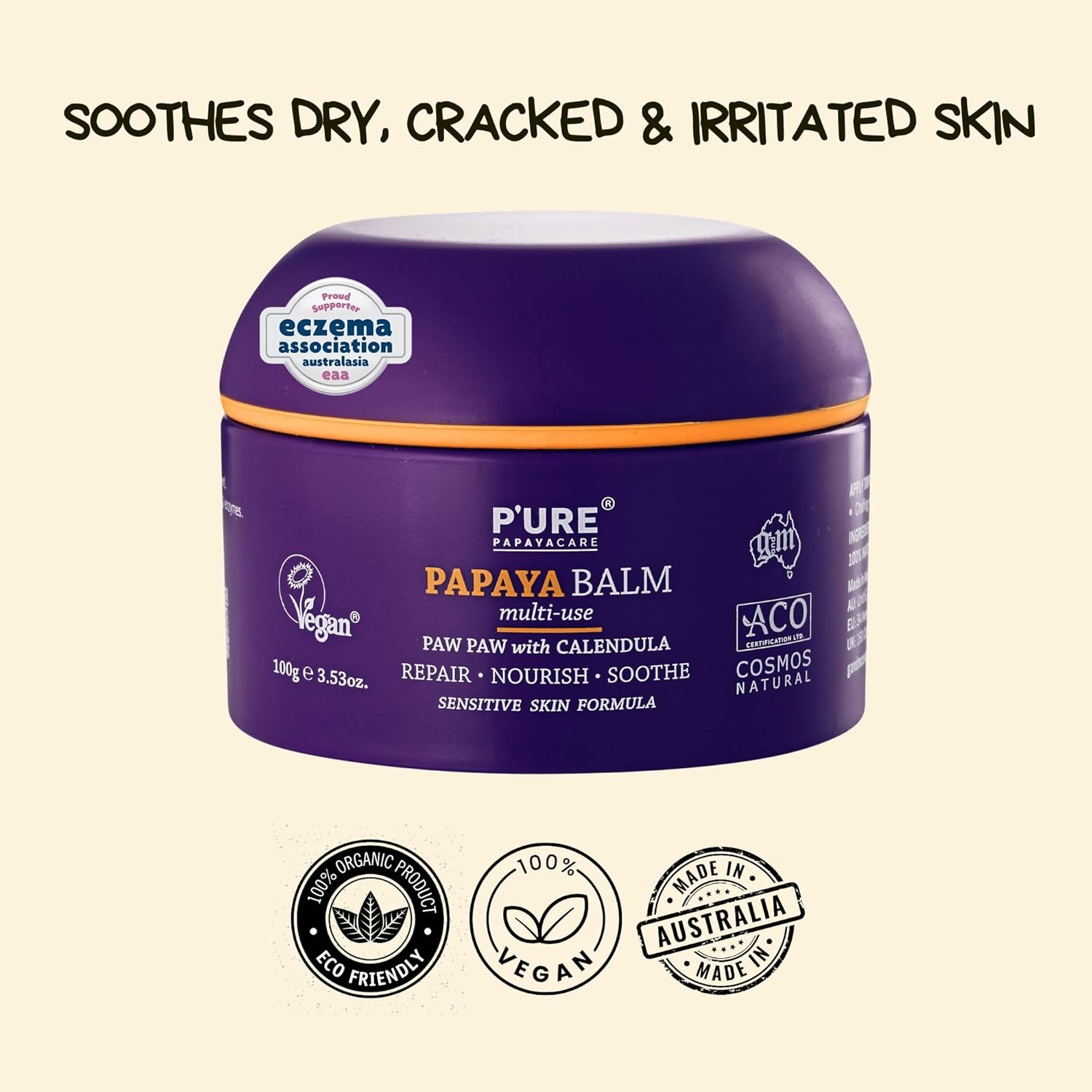 About this item Soothe Dry, Cracked & Irritated Skin and Lips – P'URE Papaya Balm is a gentle, natural formula designed to soothe, repair, and nourish dry, cracked, or irritated skin and lips. Enriched with Shea Butter and Vanilla, this multi-purpose balm supports skin elasticity, restores moisture, and keeps sensitive skin—including baby skin—healthy and balanced. It is one of the best treatments for itchy dry skin. Multi-Use Balm for All Skin Types & Ages – This versatile papaya balm repairs cracked heels, dry feet, rough elbows, and chapped hands. It also soothes chafing, softens irritated nipples, and treats nappy rash and cradle cap for babies. Ideal for after sun care, post-tattoo balm, or post-laser skin treatment, it also provides targeted dry skin repair where it's needed most. 100% Natural, Vegan & Cruelty-Free Ingredients – Formulated with natural papaya, shea butter, calendula, macadamia oil, and jojoba oil, our balm deeply moisturises and relieves irritation. Free from palm oil, petroleum, and parabens, it’s gentle enough for the whole family. This nourishing blend also works as an organic eczema treatment, offering soothing care without harsh chemicals. Easy to Apply, Fast Absorbing – Apply a small amount of Papaya Balm to dry, irritated, or cracked skin as needed. It absorbs quickly without leaving a greasy residue, making it perfect for everyday use on the face, body, lips, or even as a nappy cream. This gentle formula supports lasting dry skin repair and also works well as an organic alternative treatment for eczema and sensitive skin. Ideal for Eczema, Dermatitis & Sensitive Skin – Recommended by the Eczema Association of Australasia, our natural skincare balm provides fast-acting hydration and relief for itchy, rash-prone, or dehydrated skin. It’s a gentle solution for those seeking an alternative eczema treatment. Also recognised as one of the best treatments for dry skin, it’s suitable for daily use on sensitive areas. › See more product details,Soothe Dry, Cracked & Irritated Skin and Lips – P'URE Papaya Balm is a gentle, natural formula designed to soothe, repair, and nourish dry, cracked, or irritated skin and lips. Enriched with Shea Butter and Vanilla, this multi-purpose balm supports skin elasticity, restores moisture, and keeps sensitive skin—including baby skin—healthy and balanced. It is one of the best treatments for itchy dry skin,Multi-Use Balm for All Skin Types & Ages – This versatile papaya balm repairs cracked heels, dry feet, rough elbows, and chapped hands. It also soothes chafing, softens irritated nipples, and treats nappy rash and cradle cap for babies. Ideal for after sun care, post-tattoo balm, or post-laser skin treatment, it also provides targeted dry skin repair where it's needed most,100% Natural, Vegan & Cruelty-Free Ingredients – Formulated with natural papaya, shea butter, calendula, macadamia oil, and jojoba oil, our balm deeply moisturises and relieves irritation. Free from palm oil, petroleum, and parabens, it’s gentle enough for the whole family. This nourishing blend also works as an organic eczema treatment, offering soothing care without harsh chemicals,Easy to Apply, Fast Absorbing – Apply a small amount of Papaya Balm to dry, irritated, or cracked skin as needed. It absorbs quickly without leaving a greasy residue, making it perfect for everyday use on the face, body, lips, or even as a nappy cream. This gentle formula supports lasting dry skin repair and also works well as an organic alternative treatment for eczema and sensitive skin,Ideal for Eczema, Dermatitis & Sensitive Skin – Recommended by the Eczema Association of Australasia, our natural skincare balm provides fast-acting hydration and relief for itchy, rash-prone, or dehydrated skin. It’s a gentle solution for those seeking an alternative eczema treatment. Also recognised as one of the best treatments for dry skin, it’s suitable for daily use on sensitive areas
