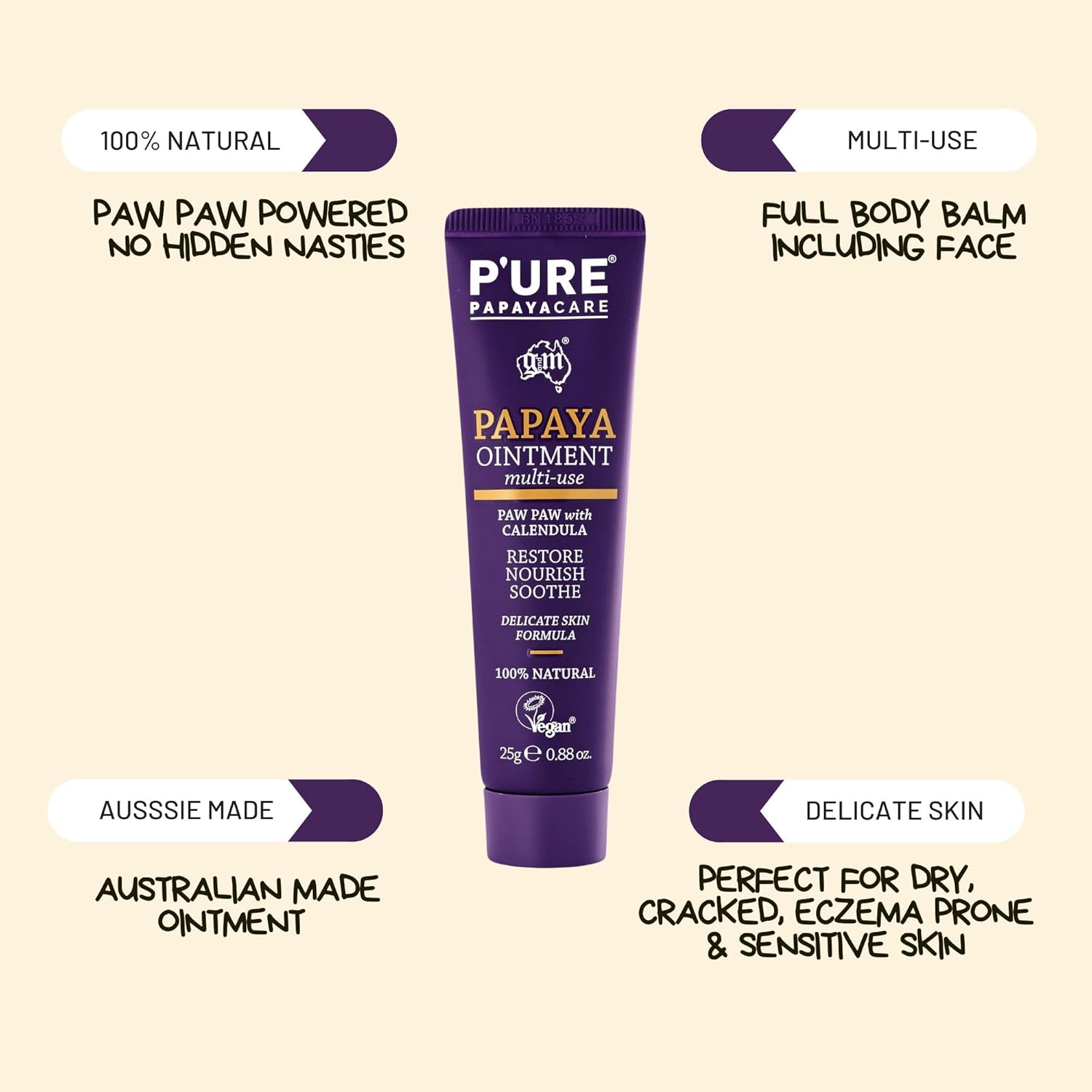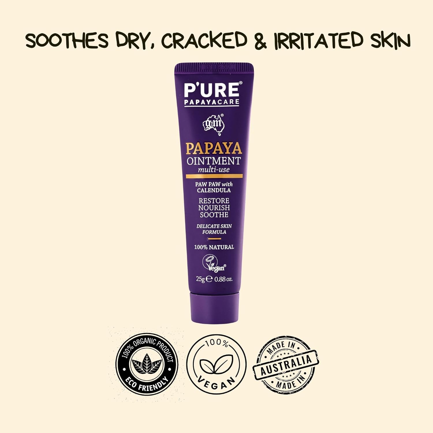 Product description Transform your Dry & Cracked Skin with our 100% Natural Dry Skin Remedy Paw Paw Ointment Key Benefits: Instantly soothes and repairs dry, cracked & irritated skin Multi-use formula for lips, heels, elbows, cuticles, nipples, and more Helps soothe irritated skin, eczema and dermatitis Gentle enough for mums, babies, and post-laser therapy treatment 100% Natural Skin Remedy Why Choose P'URE Papayacare 100% Active ingredients No petroleum, parabens, sulphates, artificial colors or fragrances Papaya enzymes stimulate skin regeneration Calendula-rich in antioxidants for calm, healthy skin How to Use: Apply as needed throughout the day to dry or irritated areas. Warm tube in hands if product hardens in cold temperatures. Store at room temperature away from direct sunlight Safety Warning For external use only. Keep away from children,Natural Dry Skin Remedy β Made from 100% natural ingredients, this formula soothes, restores, and protects dry, damaged skin without petroleum jelly or artificial additives. Crafted from Australian-grown Paw Paws, itβs a trusted skin ointment for dry skin, ideal for those seeking gentle, effective relief with clean, nourishing ingredients,Multi-Purpose Healing β This nourishing balm provides relief for common skin concerns like chapped lips, minor burns, cuts and insect bites. Made with gentle, natural ingredients, it also works effectively as a skin eczema ointment while supporting everyday skin recovery. Make the switch to a natural choice and feel the difference,Paw Paw Ointment β Packed with vitamins, nutrients, and enzymes from fermented Australian papaya fruit to deeply nourish and hydrate the skin. Free from petroleum, itβs a clean, effective skin ointment for dry skin that supports natural healing. Say NO to paw paw ointments containing petroleum and choose a more skin-friendly option,Vegan & Cruelty-Free β Proudly endorsed by the Eczema Association of Australasia and certified vegan, PβURE Papayacare offers ethical, skin-friendly care you can trust. This gentle skin eczema ointment is made with natural ingredients and suitable for sensitive skin. All products are also Eco Certified for a more conscious choice,Australian-Made Quality β This trusted pawpaw ointment is expertly crafted in Australia, blending the healing power of fermented papaya with nourishing calendula, shea butter, and macadamia oil. Skin ointment designed to hydrate, soothe, and protect, it delivers high-quality care for dry, sensitive, and damaged skin