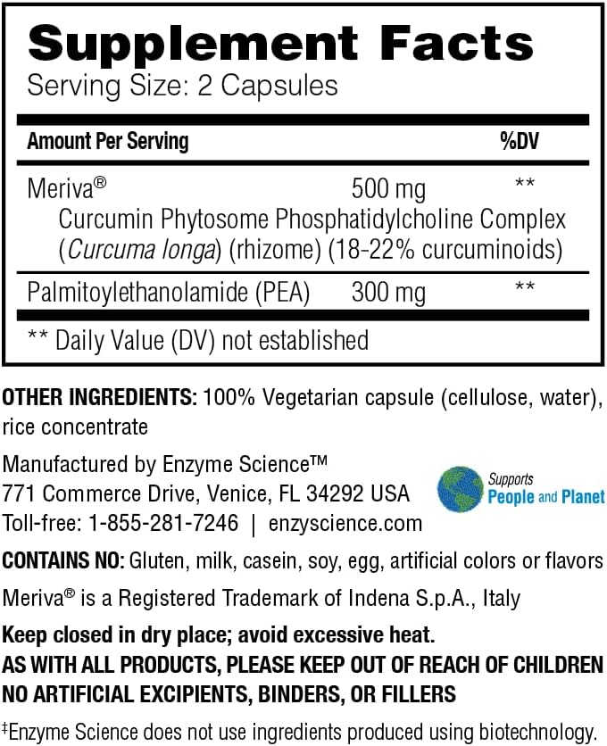 PHYSIOLOGICAL SUPPORT. Enzyme Scienceās (PEA)+ supplement helps provide support for physiological stress or discomfort associated with occasional stiffness and compromised tissue function as a result of overexertion and everyday stress10ALL-NATURAL. Palmitoylethanolamide (PEA) is a clinically studied, natural ingredient from safflower seed. It has been utilized for decades and is available in dietary supplements worldwide as an option for the onset of physiological stress10SAFFLOWER + CURCUMIN. Enzyme Scienceās (PEA)+ features PEA from safflower seed paired with the well-researched, patented, and highly bioavailable curcumin, Meriva Phytosome10BALANCE & WELL-BEING. PEA works with the body to help support natural PEA production balance, calm discomfort, and promote levels for well-being.* It helps provide natural support for the entire body with a focus on the body's nervous, immune, and muscular systems10DEDICATED TO QUALITY. Enzyme Science represents exceptional solutions for digestive health. We offer unique formulations designed to provide optimal solutions for digestive health and wellness1010
