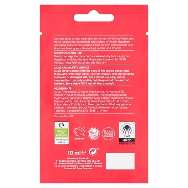Product Information:Get Your Glow On And Treat Yourself To Our Refreshing Peach Jelly Mask! Containing Niacinamide And A Blend Of Peach, Raspberry And Apple Extracts, This Mask Will Help To Even Out And Brighten Your Skin Tone Leaving Your Skin Looking Radiant And Smooth,Features:Hydrating,Warning Or Restrictions:For External And Adult Use Only. Keep Out Of Reach Of Children. Use As Directed. Not For Use On Sensitive Or Broken Skin. We Recommend Testing A Small Quantity Of Mask Behind The Ear Prior To Use β If Sensitivity Occurs, Do Not Use. Avoid Contact With Eyes, If Product Gets Into Eyes Rinse Well With Clean Water,Product Specification:Aqua, Propanediol, Glycerin, Niacinamide, Polysorbate 20, Parfum, Propylene Glycol, Carbomer, Hydroxyethylcellulose, Hydroxyacetophenone, Xanthan Gum, Sodium Hydroxide, Prunus Persica Leaf Extract, Ascorbic Acid, Pyrus Malus Fruit Extract, Rubus Idaeus Fruit Extract, Phenoxyethanol, Ethylhexylglycerin, Linalool, Citronellol, Benzyl Alcohol, Alpha-Isomethyl Ionone, Ci 15985, Ci 14700,Product Uses:Simply Cleanse Your Face With Warm Water And Pat Dry. Apply The Mask With Your Fingertips. Allow The Mask To Absorb Into Your Skin. Can Be Rinsed Off Or Left On As Desired. If Rinsed, Pat Dry With A Soft Towel To Remove Any Excess Moisture. Dispose Of The Packaging Responsibly