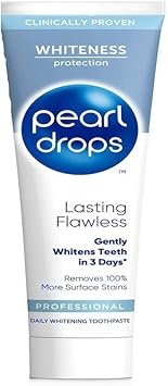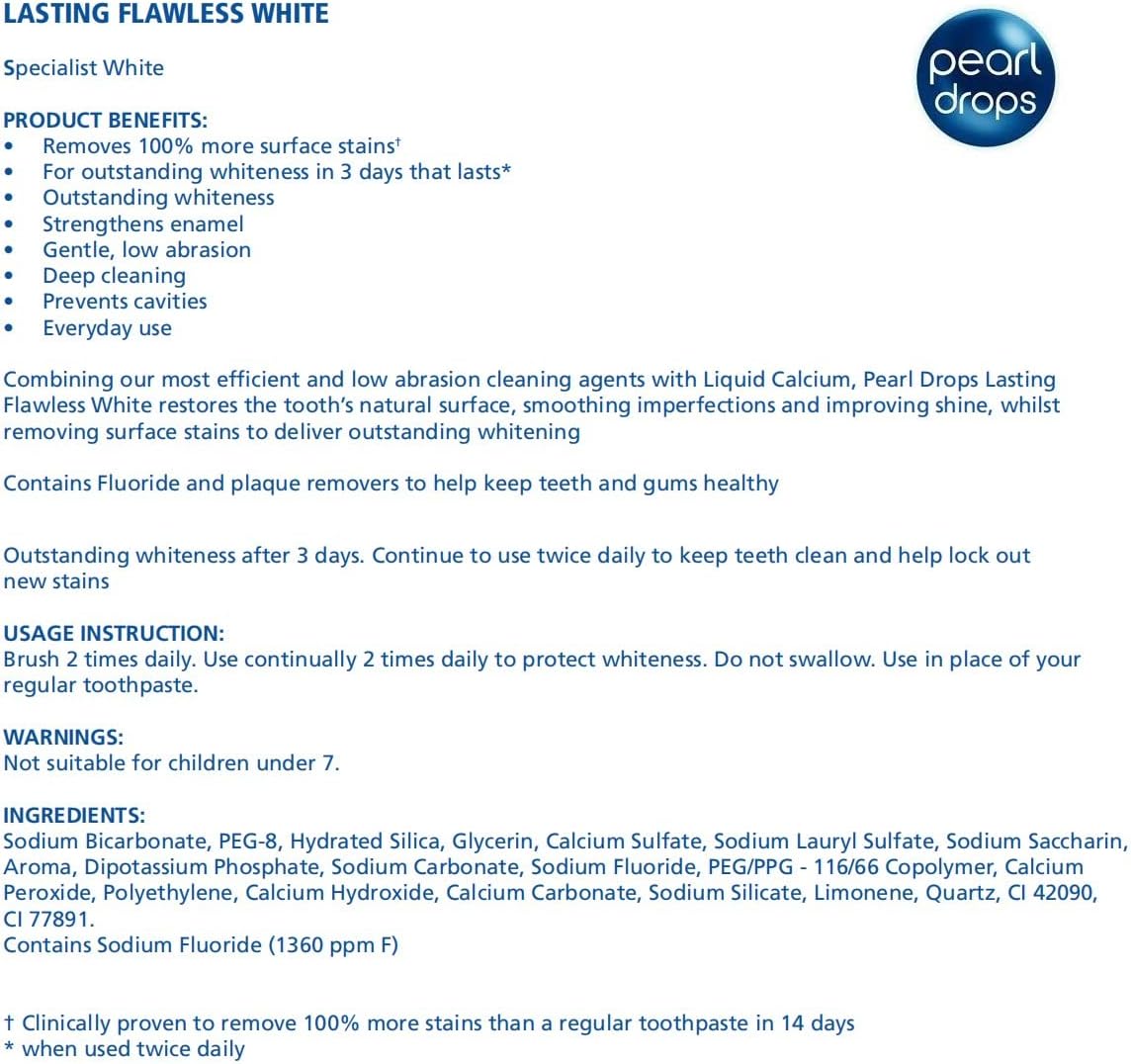 Product Description Pearl Drops Lasting Flawless White Toothpolish has been developed by our whitening experts to deliver superior stain removal and protection, for a brighter, whiter, healthier smile. combining our most efficient and low abrasion cleaning agents with our patented Stain Prevention Technology, Pearl Drops Flawless Lasting White restores the tooth's natural surface, smoothing imperfections and improving shine, whilst removing surface stains to deliver outstanding whitening. Ingredients Sodium Bicarbonate, PEG-8, Hydrated Silica, Glycerin, Calcium Sulfate, Sodium Lauryl Sulfate, Sodium Saccharin, Aroma, Dipotassium Phosphate, Sodium Carbonate, Sodium Fluoride, PEG/PPG - 116/66 Copolymer, Calcium Peroxide, Polyethylene, Calcium Hydroxide, Calcium Carbonate, Sodium Silicate, Limonene, Quartz, CI 42090, CI 77891, Contains: Sodium Fluoride (1360 ppm F) P.when('A').execute(function(A) { A.on('a:expander:toggle_description:toggle:collapse', function(data) { window.scroll(0, data.expander.$expander[0].offsetTop-100); }); }); Directions Squeeze a pea-sized amount of toothpaste onto a toothbrush. Brush teeth thoroughly for approximately 2 minutes, covering all surfaces. Rinse mouth thoroughly after brushing. Do not swallow. Use twice daily. Safety Warning Do not swallow, for adult use only. Contains fluoride โ may be harmful if swallowed in large amounts. Manufacturer Contact Information Church & Dwight UK Ltd., Folkestone, CT19 6PG, UK. Sofibel SAS, 110-114 Rue Victor Hugo, 92686 Levallois-Perret, France. See more,Removes 100 Percent more stains than a regular toothpaste in 14 days,Teeth will look visibly whiter after 5 days,Continue to use twice daily to keep teeth clean and help lock out new stains,Clinically tested and safe for everyday use,Contains Flouride and plaque removers to help keep teeth and gums healthy