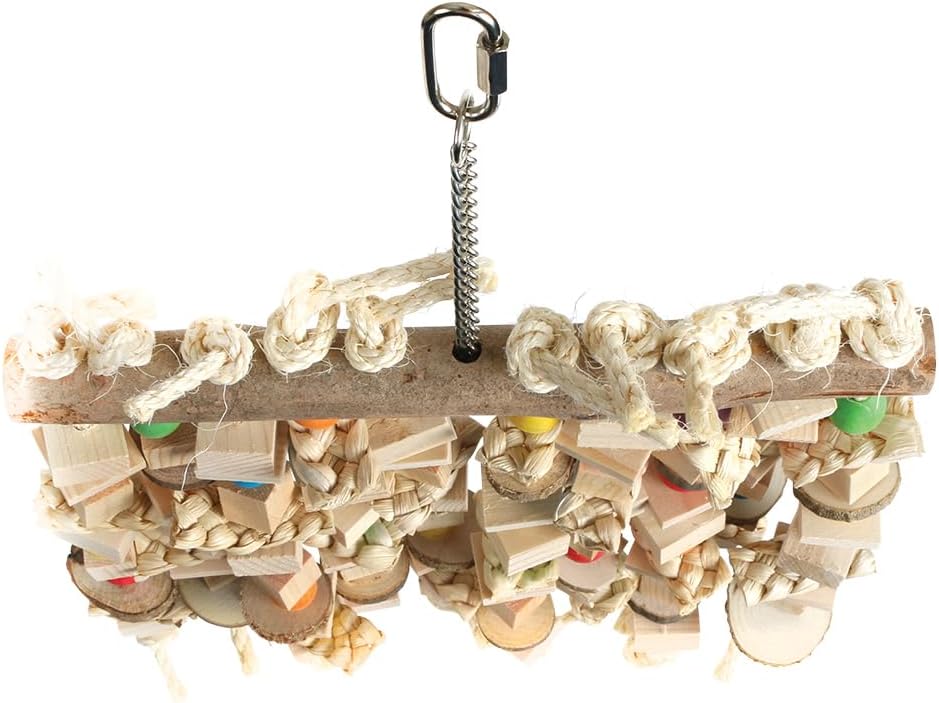 A large wooden toy for Parrots to chew on. This Peek and Play Wood and Rope Parrot Toy has over 150 chewable parts and plenty of bark to occupy your Parrotâ€s beak. With lots of wood slats, cubes, beads, and discs to gnaw on, your Parrot can enjoy chewing away whilst helping to keep their ever-growing beak healthy and trim. If that was not enough, your beaky buddy will find plenty of knotted sisal rope to unravel, pick apart, untie and preen with. Use the metal quicklink provided to quickly and securely fasten this Peek and Play Toy to your Parrotâ€s cage or play gym stand. Dimensions Length 45cm (18") Width 30cm (12") Materials Wood, Sisal, Maize Leaf, Metal