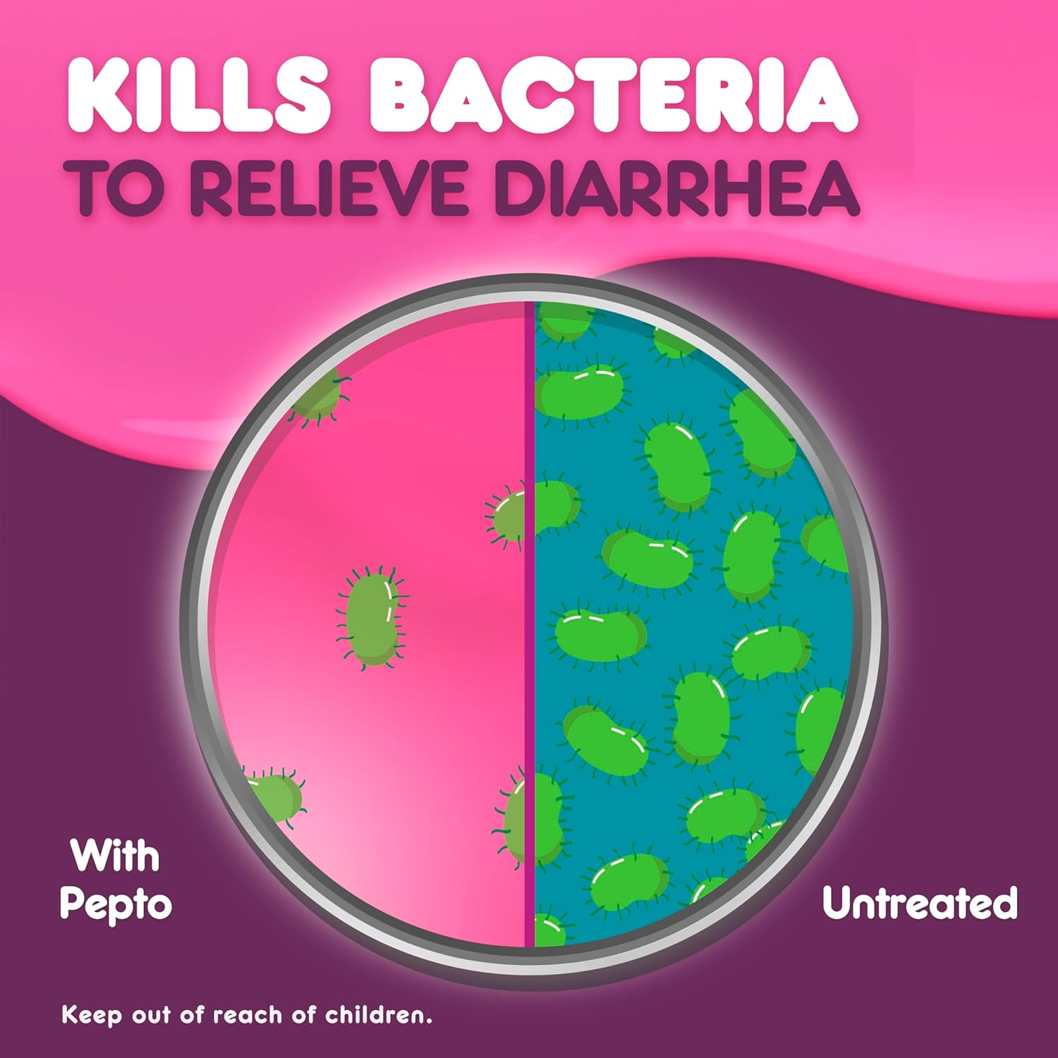DUAL-ACTION RELIEF: Pepto Diarrhea coats and kills bacteria that cause diarrhea, providing effective relief from both the symptoms and the cause of diarrhea
